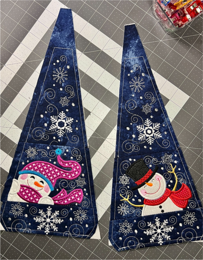 These sweet, wintery snow people are perfect for seasonal jeans. Stitch one each of your choice of the Inner, Middle, and Outer blocks to form a triangular panel following the tree skirt instructions.
