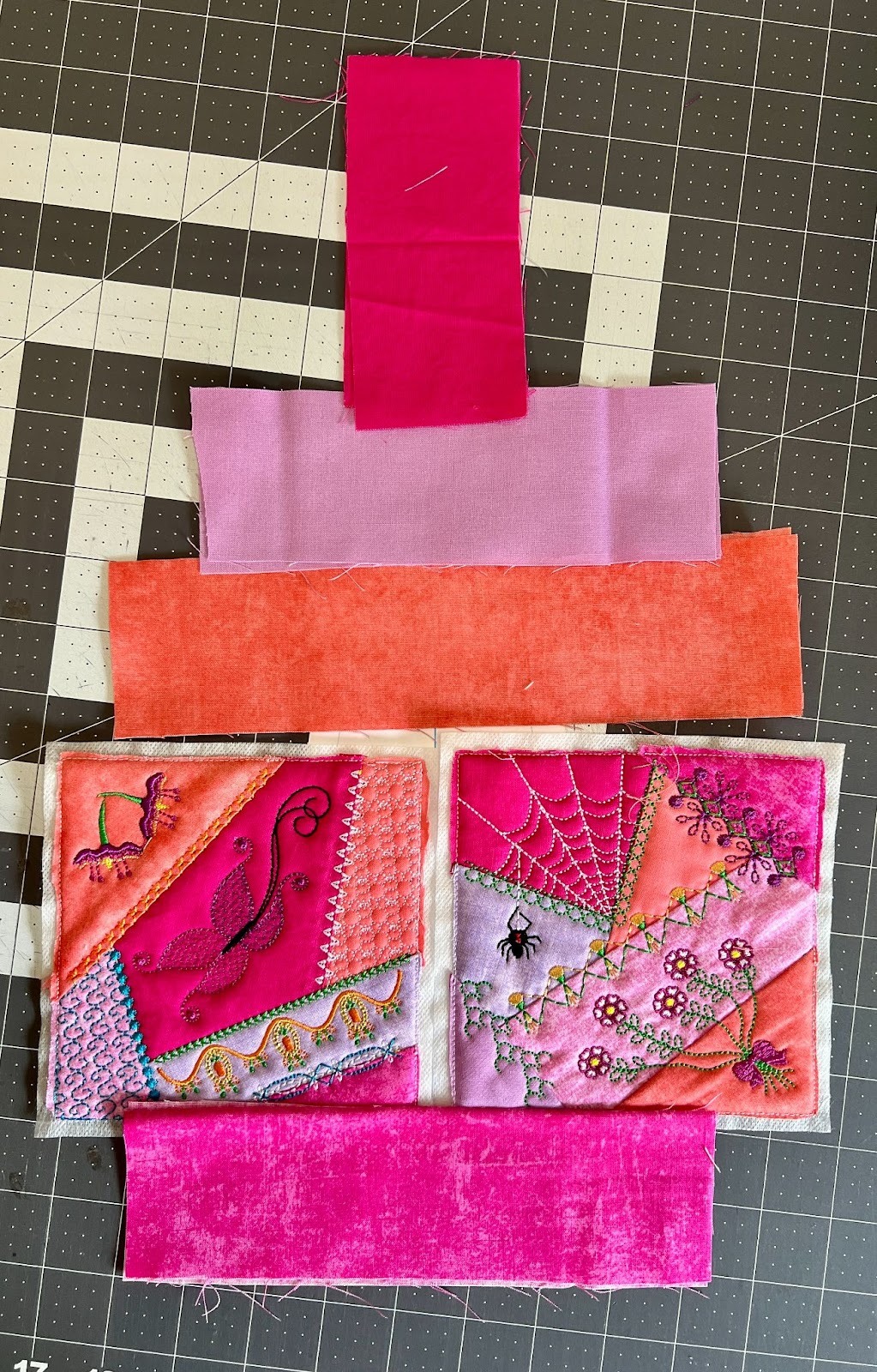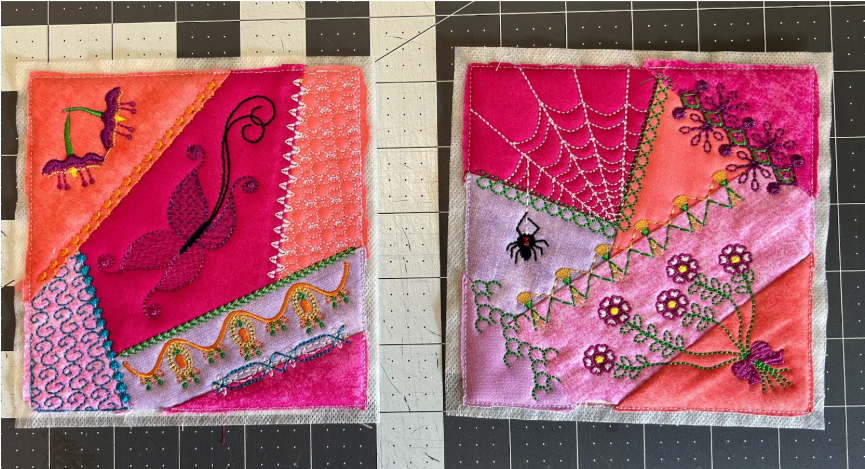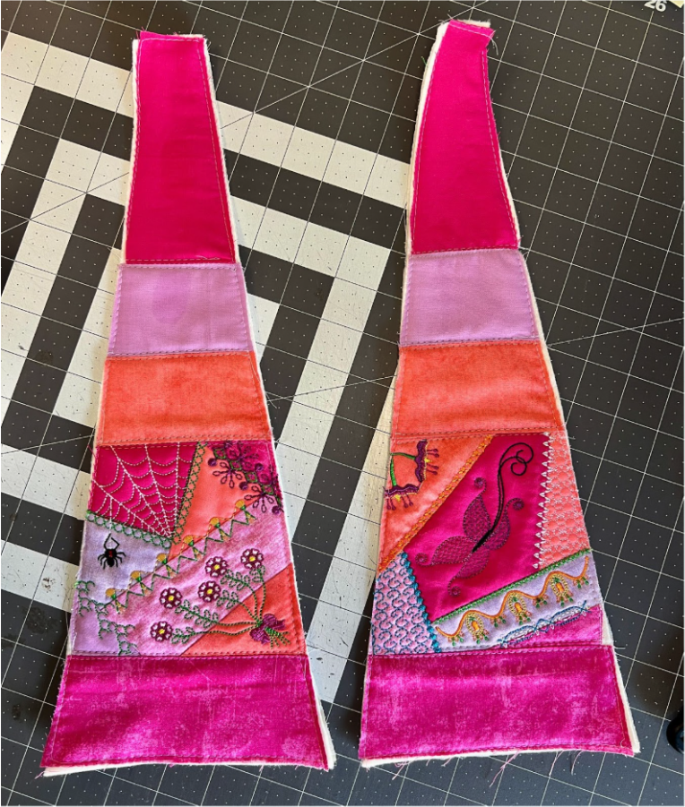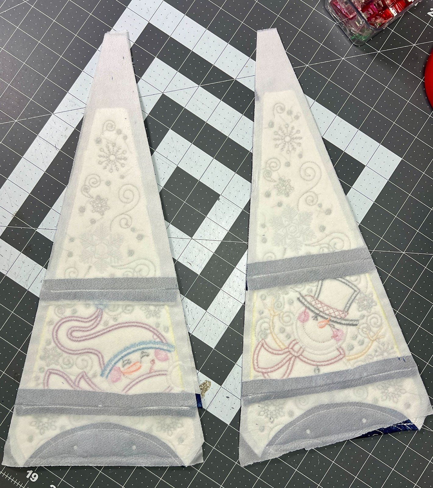 Using coordinating scraps and batting, I created embroidered panels to be used for the inserts. For one pair, I used the Crazy Patch Blocks Series 1, Set 2 and Set 3 and included beautiful details like webs, florals, and vibrant fabrics. For another pair, I used panels from the ITH Snowman Tree Skirt to add a sweet, wintery twist.