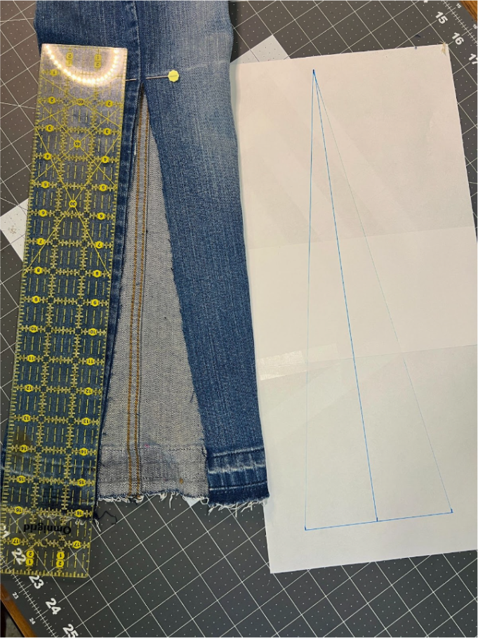 Create a paper pattern for the inserts using the desired measurements and adding ½” for seam allowances. Draw a long, tapered triangle on paper. This will help your inserts sit smoothly inside the jeans and keep everything even.