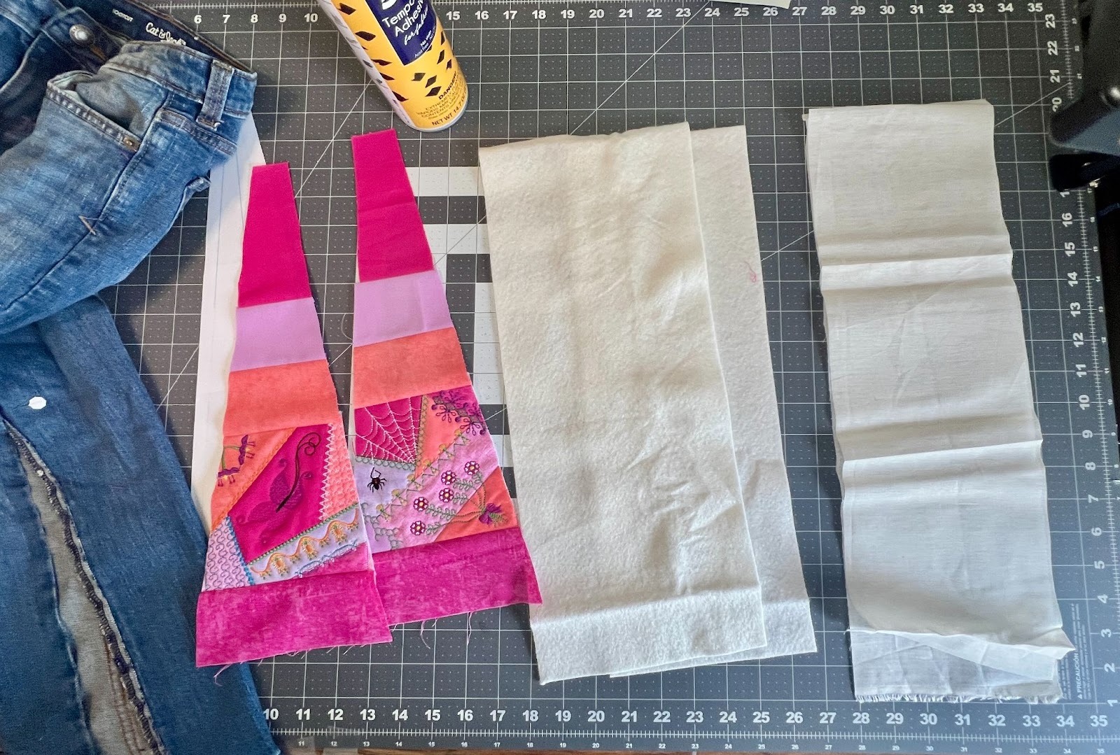 I chose to add some fusible backing to each panel to protect my granddaughter’s skin from the stitching and to produce a more finished look before sewing inserts into each leg opening.