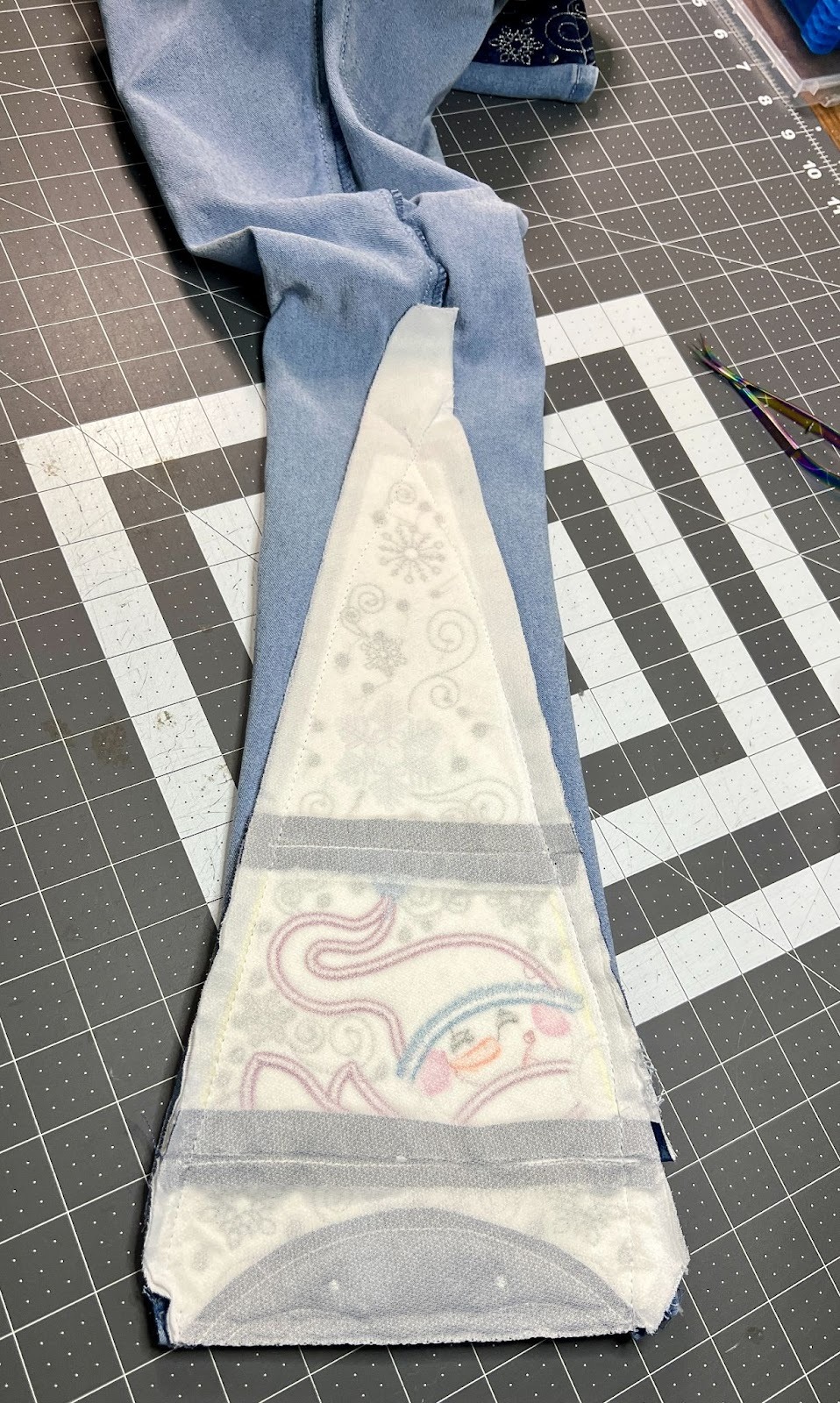 Using a seam ripper, carefully open the outer seams of each leg from the hem to the marked line, just below the knee. This creates space for the embroidered insert.