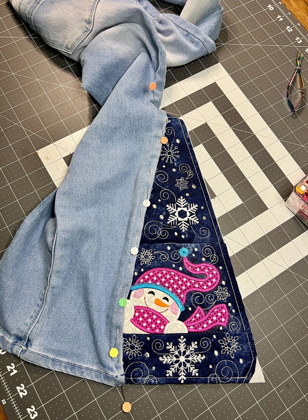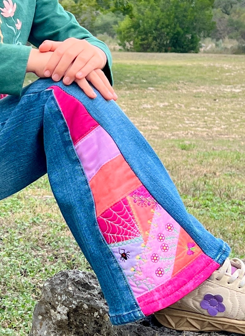 In this post I’ll walk you through the two sets of inserts I recently made for my 7-year-old granddaughter, using panels from the cozy Snowman Tree Skirt and a couple of bright Crazy Patch blocks full of color and texture. Each one turned a simple pair of jeans into a keepsake she’ll treasure.