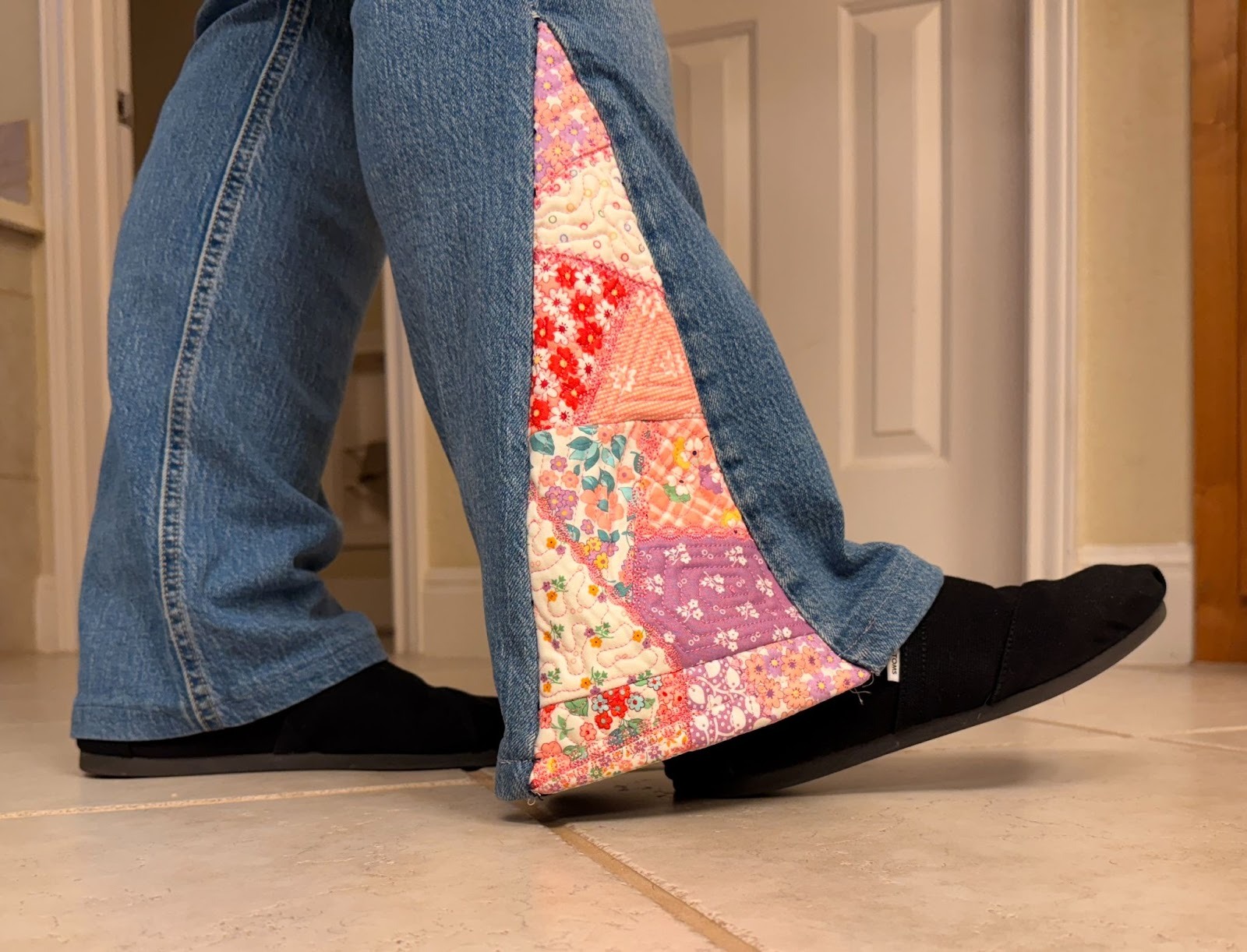 Another talented stitcher, Robin Riley, used panels from the ITH Crazy Patch Tree Skirt to create a charming pair of refashioned jeans. With soft vintage floral fabrics and quilt-style piecing, her version shows just how versatile this idea can be!