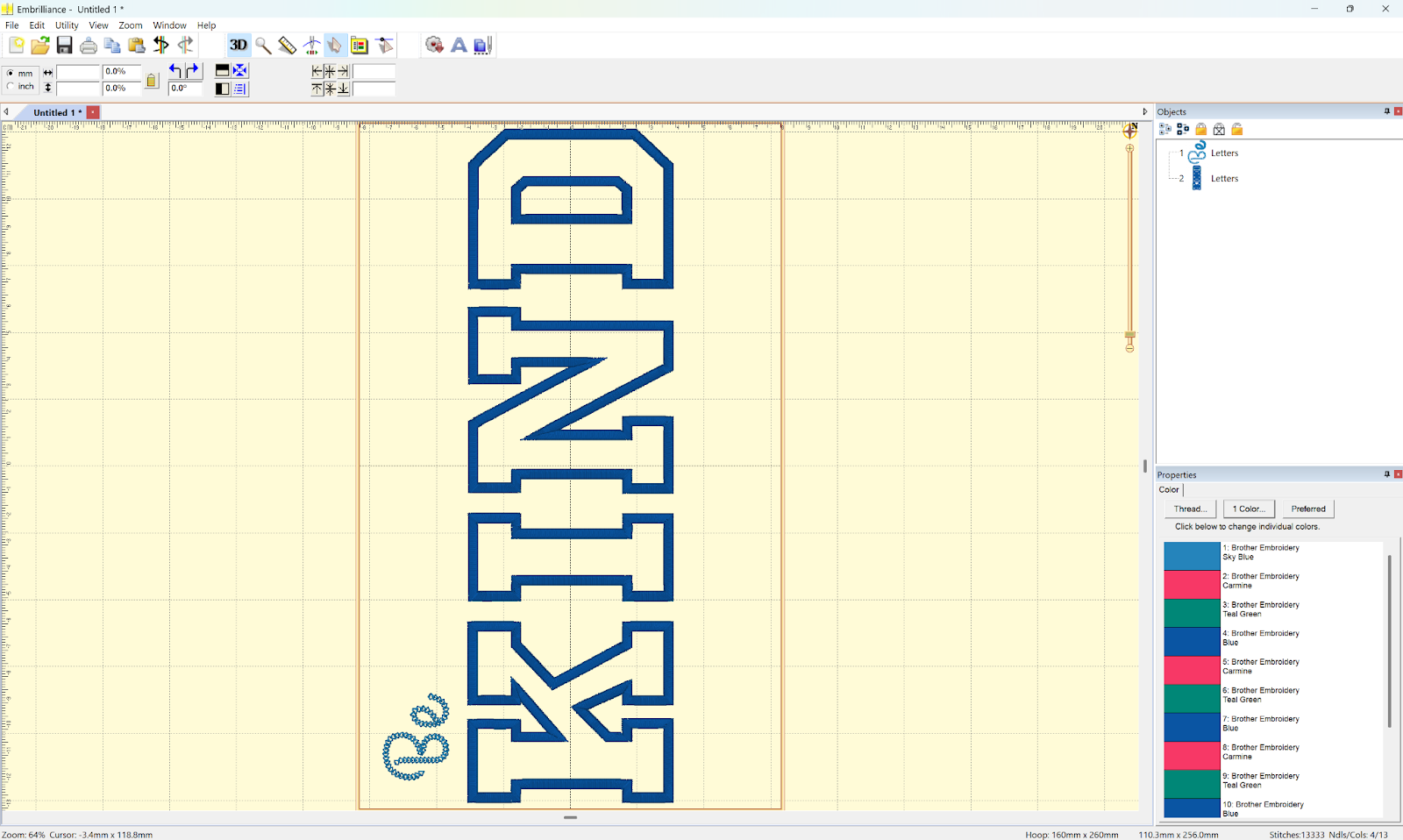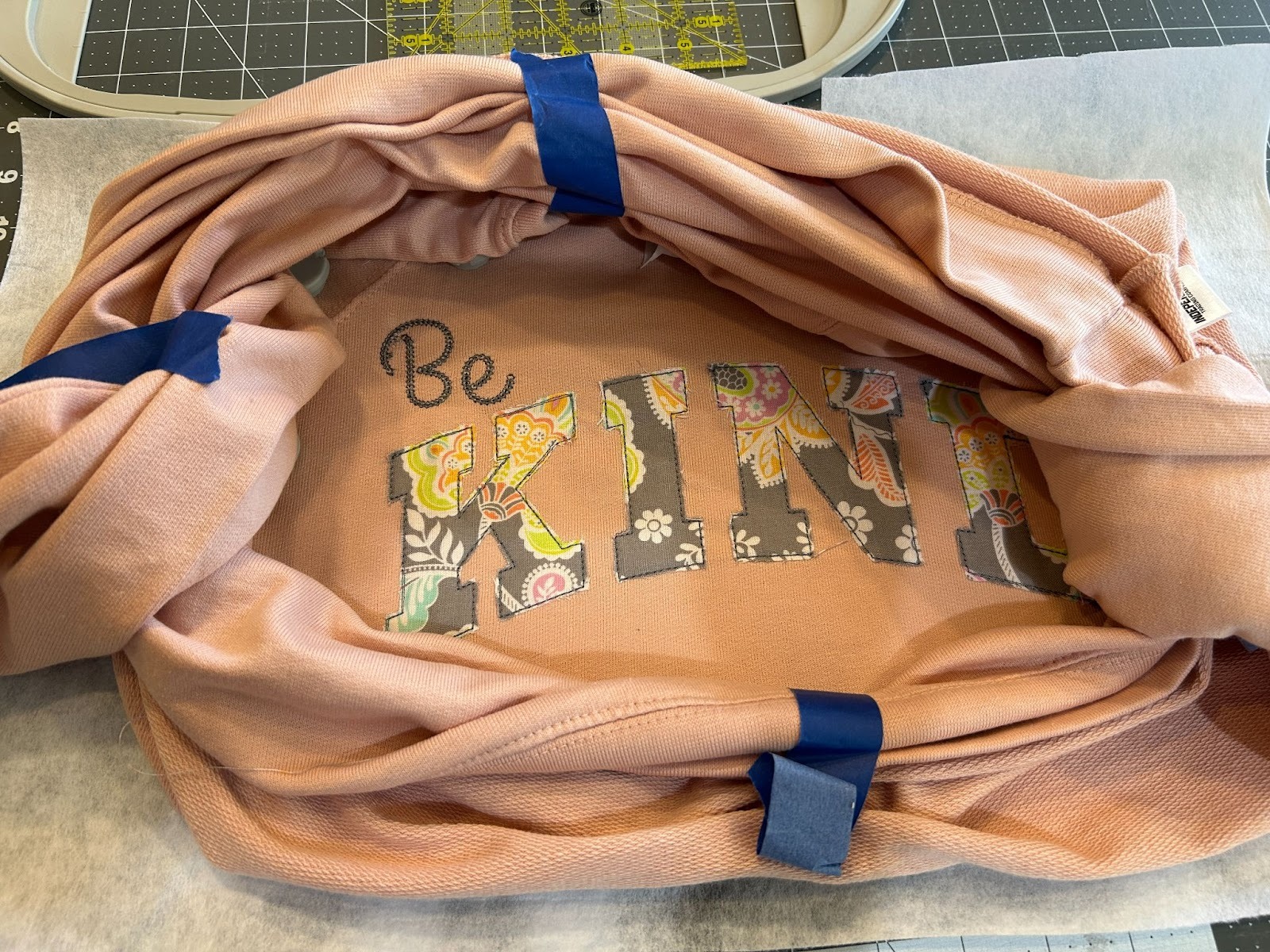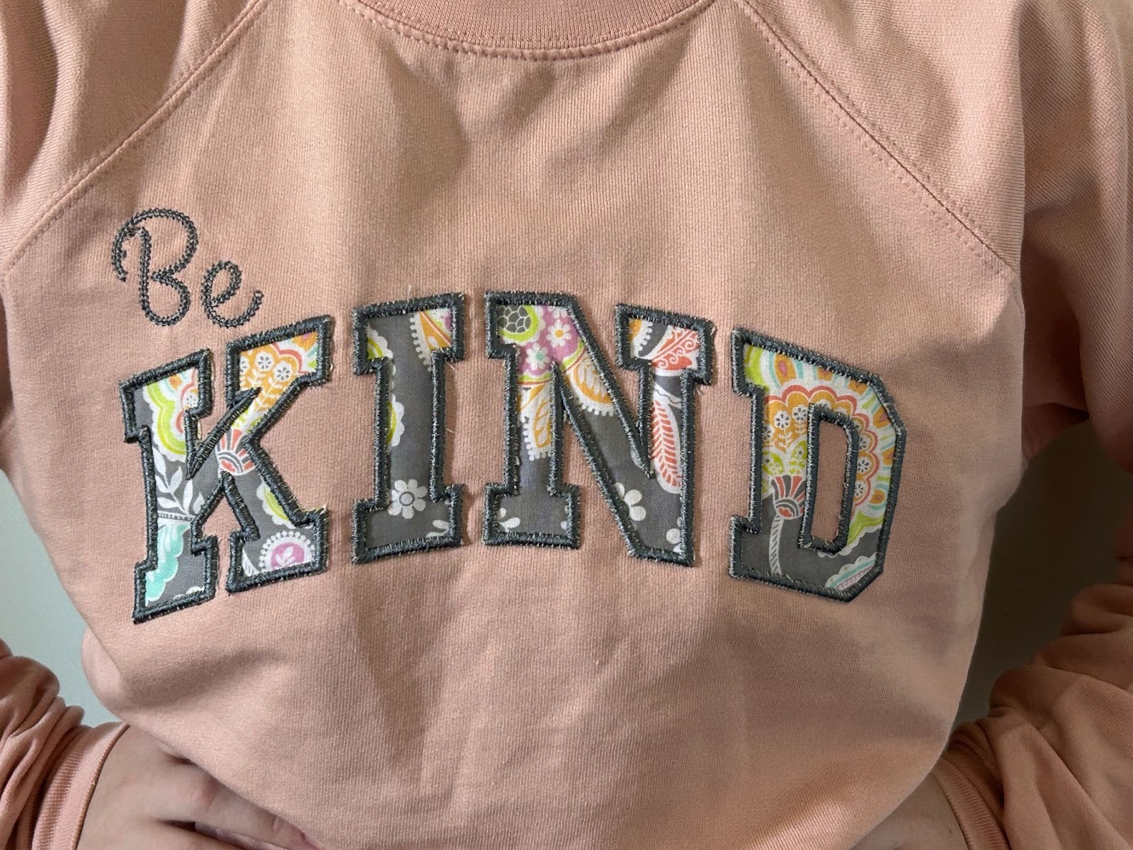 I started in Embrilliance and typed in the words I wanted for my shirt. I used the Graceful Chain Stitch Font for the word “be” and the Varsity Applique Alphabet (satin edge) for the word “kind”.