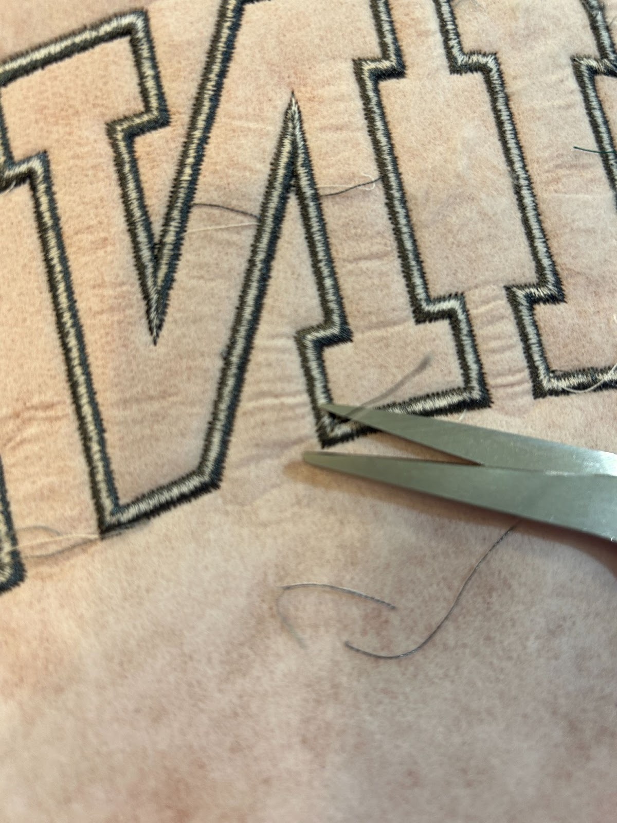 Take the hoop out of the machine and trim around the letters close to the stitches.