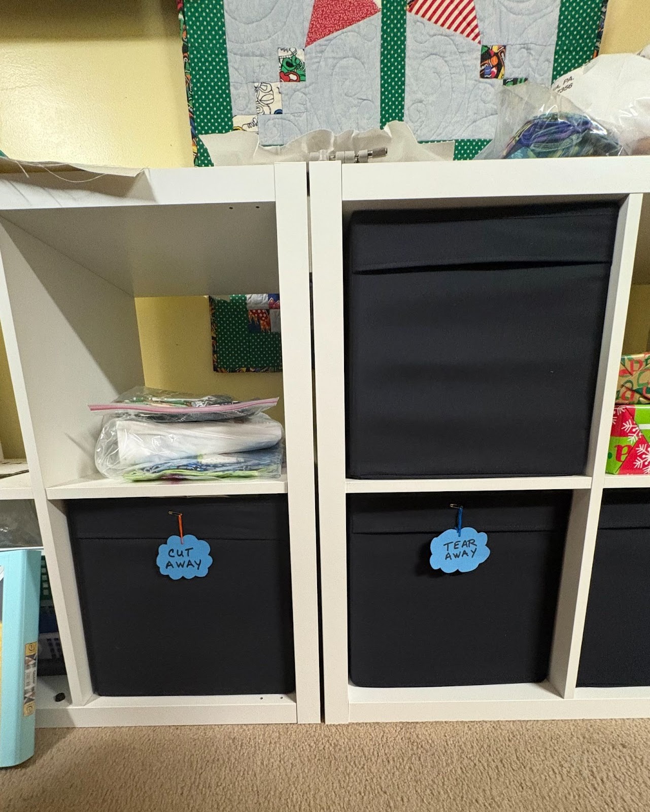 I also would go back in time and give myself a not-so-gentle smack upside the head, because this one took me way too long to start doing even after I realized it was a problem. If you buy stabilizer from a shop where they cut it for you, label, label, label the stabilizer so your future self knows what it is. Is it Tender Touch™ to cover stitching so it doesn’t itch? Is it a woven stabilizer? Believe me, you will not remember, so label it.
