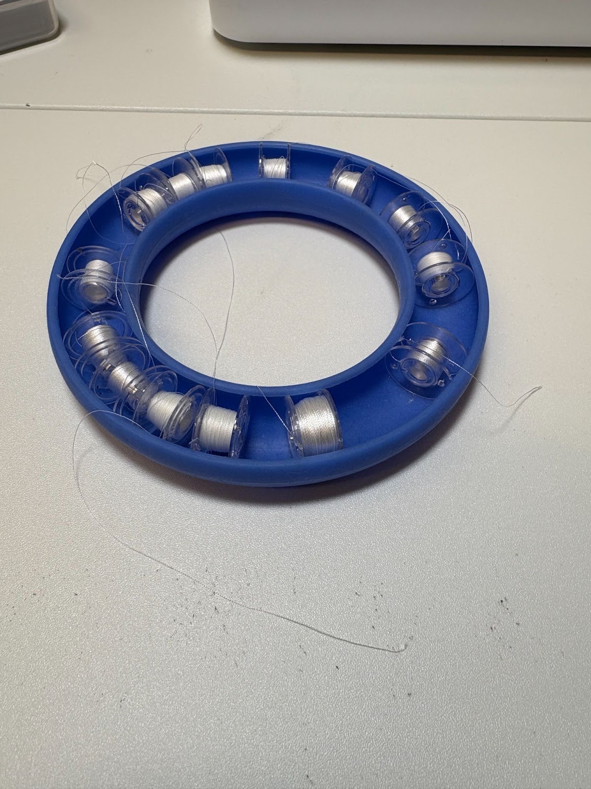 Bobbin thread is a finer weight than the regular embroidery thread. My go-to embroidery thread is Madeira 40wt. Bobbin thread comes in 60wt. and 90wt. (My machine uses 60wt.) Even though the weight number is higher, it’s a lighter thread. It helps to reduce bulk on the back of the design and unless the tension needs adjusting, it doesn’t show up on the top of the design. Bobbin thread comes in white or black. After machine embroidering for a good number of years and having done a variety of projects, I’ve yet to need black bobbin thread. Further down I say not to run out and buy stuff, so black bobbin thread is one thing I’d say not to buy until or unless you have a specific need for it. The good news is, bobbin thread is less expensive than embroidery thread. I buy it on spools and wind bobbins. Some people buy pre-wound bobbins but I never have. I usually make sure to have one or two fully wound bobbins at the beginning of a large project because I don’t like stopping in the middle of whatever I’m working on.