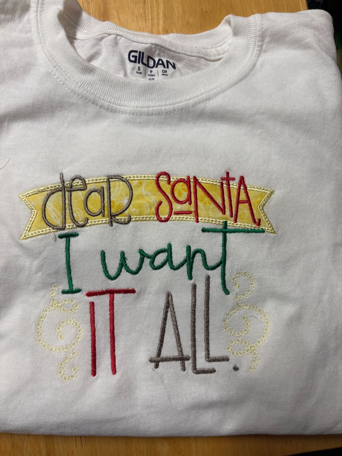 What else would I tell my beginner self? That’s easy: you’ll make mistakes, some fixable, some not. Don’t throw them away. After doing the Halloween shirt, one of my next projects was making Christmas shirts for my granddaughters. On one of them, I made a big mistake: the back of the shirt got caught up in the stitching under the hoop. If you’ve been there done that, you’re nodding along with me. But that mistake taught me to run my hands along the edges of the hoop before pushing the start button.