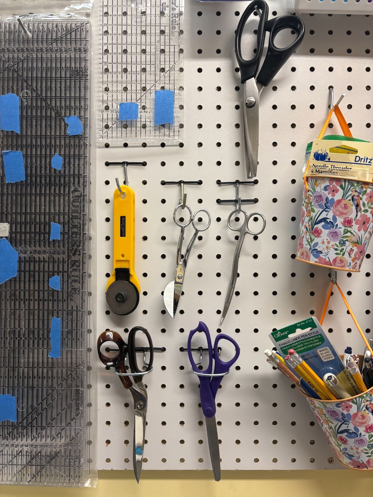 I purchased good applique scissors. They hang right above my work station so they're within easy reach when I take the hoop off the machine to trim the fabric. They go right back on the hook when not being used so I don’t accidentally lay something on top of them and cause damage.