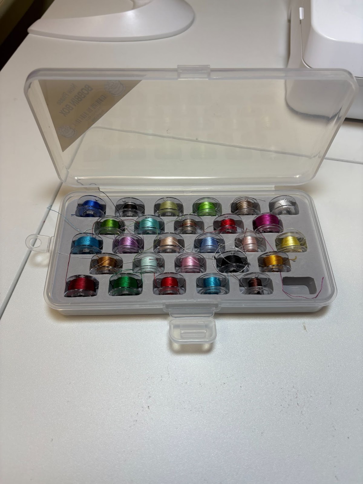 Now let’s talk about what my beginner self should have known but didn’t. First, there’s such a thing as bobbin thread. Not knowing this, I filled a bobbin for every color I was using. Years later, I still have a bobbin storage case with embroidery thread colors wound on them. When I remember, I try to use one of them up before reaching for a spool of thread. As you can see, I don’t remember well.