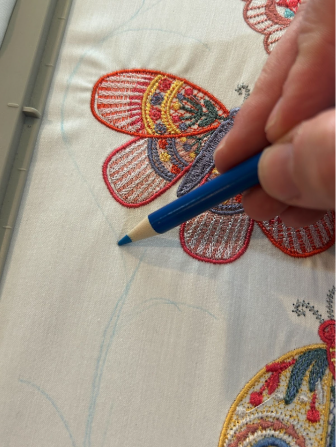 While the design is still in the hoop, I like to sketch my hand design on the fabric.