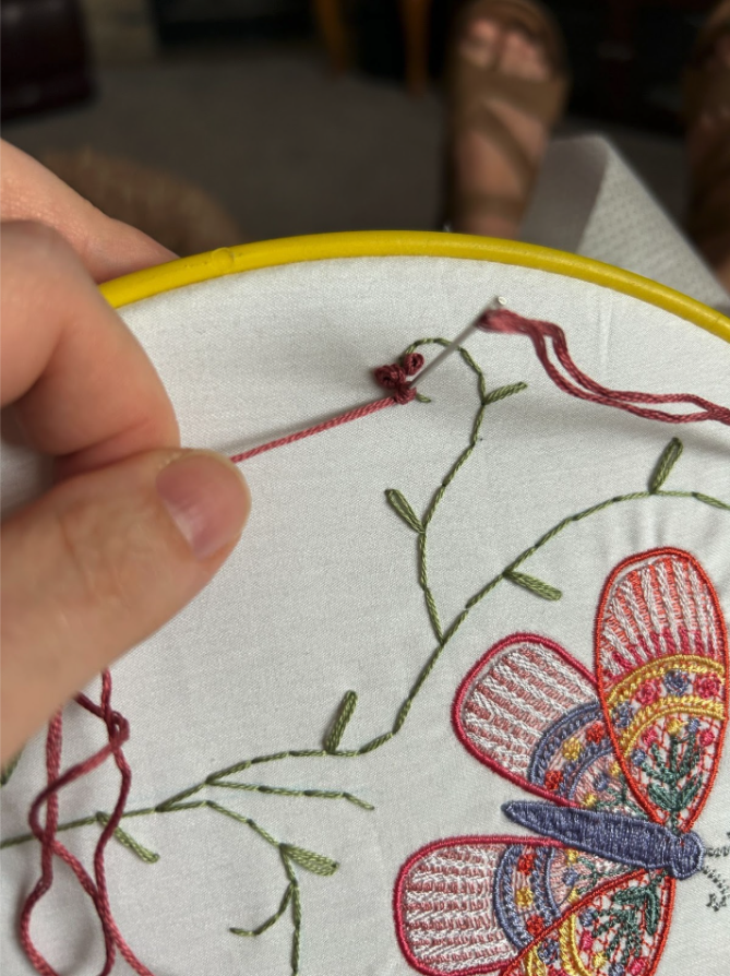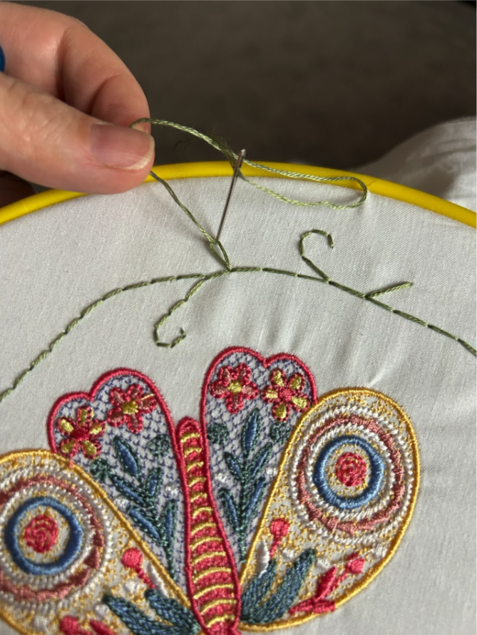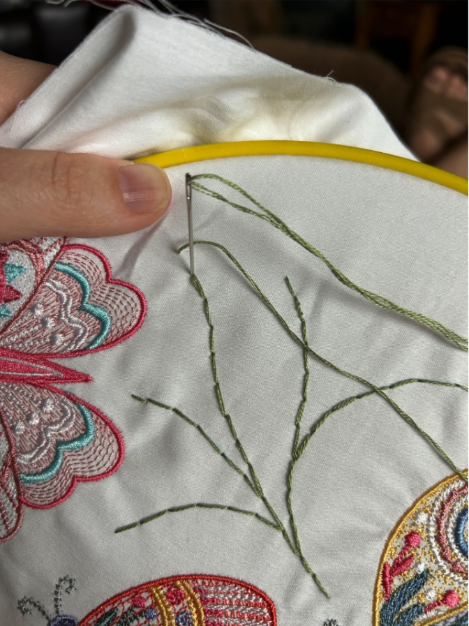 Then continue with your stitches. I used a variety of stitches in my designs. A backstitch for some greenery stems worked great.