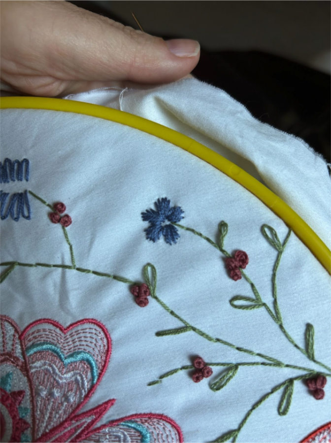 I added french knots as berries and parts of the flowers around the design. These add a little three-dimensional pop to your design.