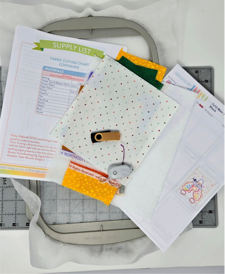 Print out your design instructions and load your preferred design format to a USB stick. Cut your fabric pieces according to the directions provided with each placemat design. I am doing the alternate 7x12 size. This design can also be made with 5x7 and 6x10 hoops; you would just need to do it in extra hoopings. It is all explained in the instructions that accompany the designs.