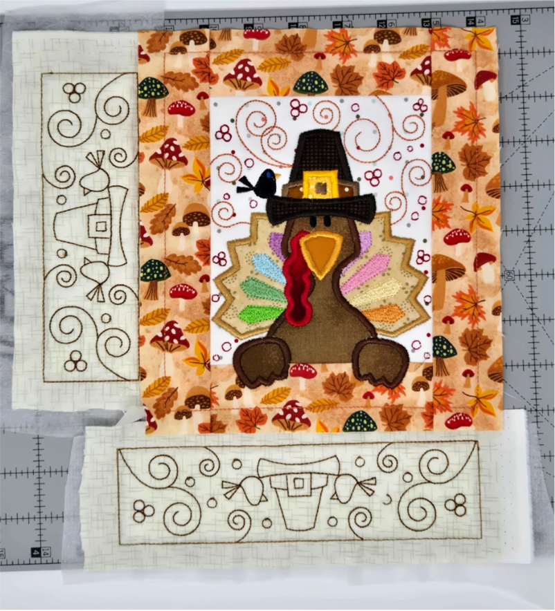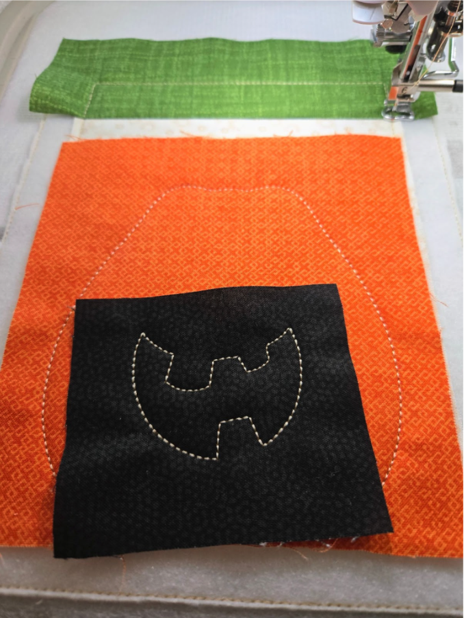 Embroider the turkey, scarecrow, and jack-o’-lantern according to the instructions you printed from the design files. When stitching applique designs, I stitch down as many appliques as I can before removing my hoop to trim. This saves me time. Here is Jack with the pumpkin outline, his mouth, and the top border all stitched before I need to remove my hoop to trim. I am always thinking ahead, trying to save myself a bit of time.