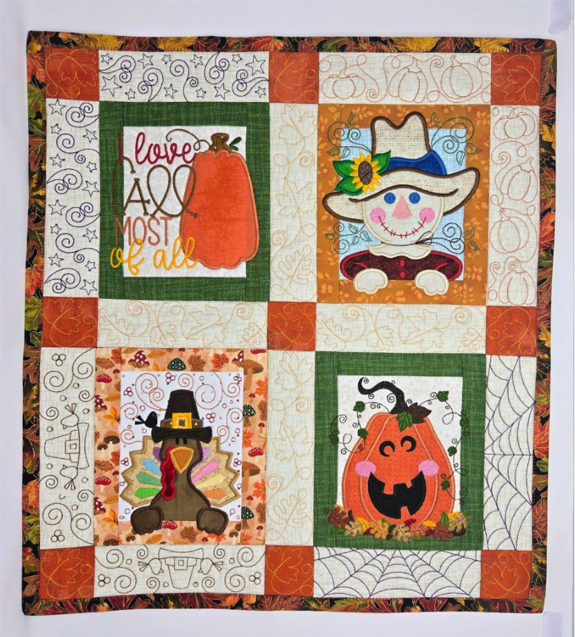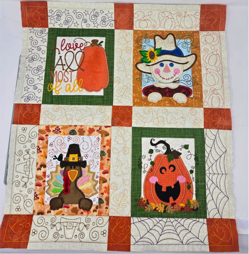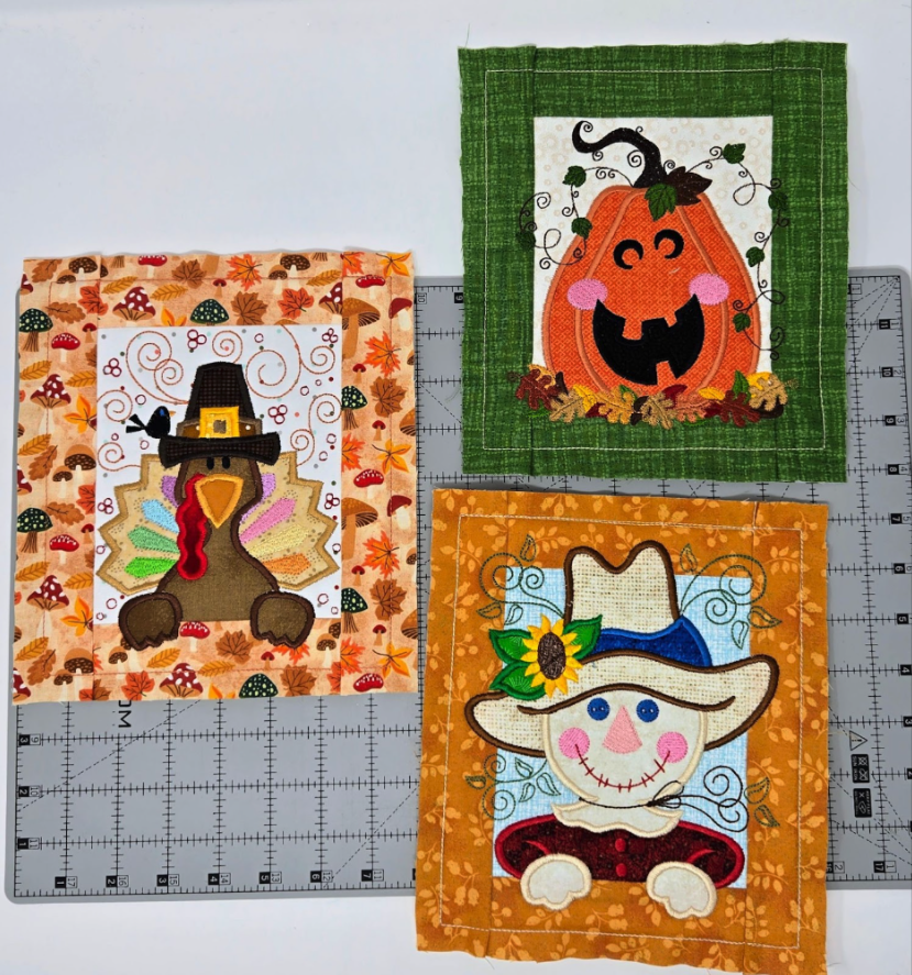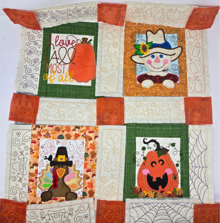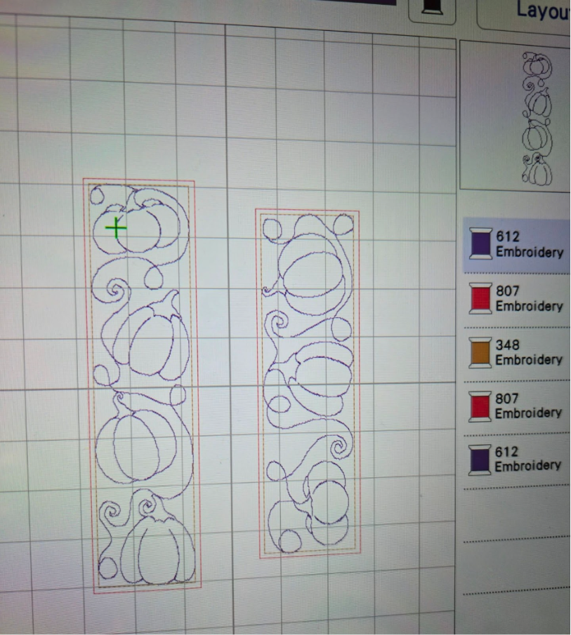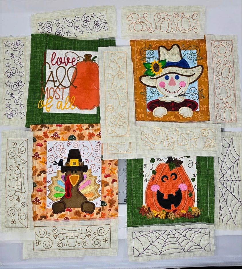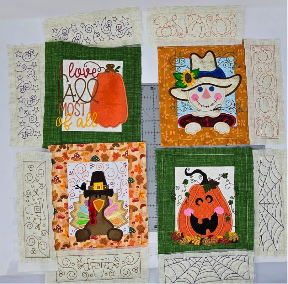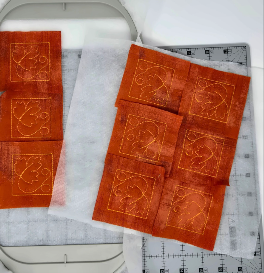 Finally, I needed cornerstones to complete my wall hanging. I chose a 2x2 leaf from the same Quilting Backdrop files. I needed nine, so I added six to one 6x10 hooping, then went back and stitched three more. I also double stitched each leaf like I did for the pumpkin borders.