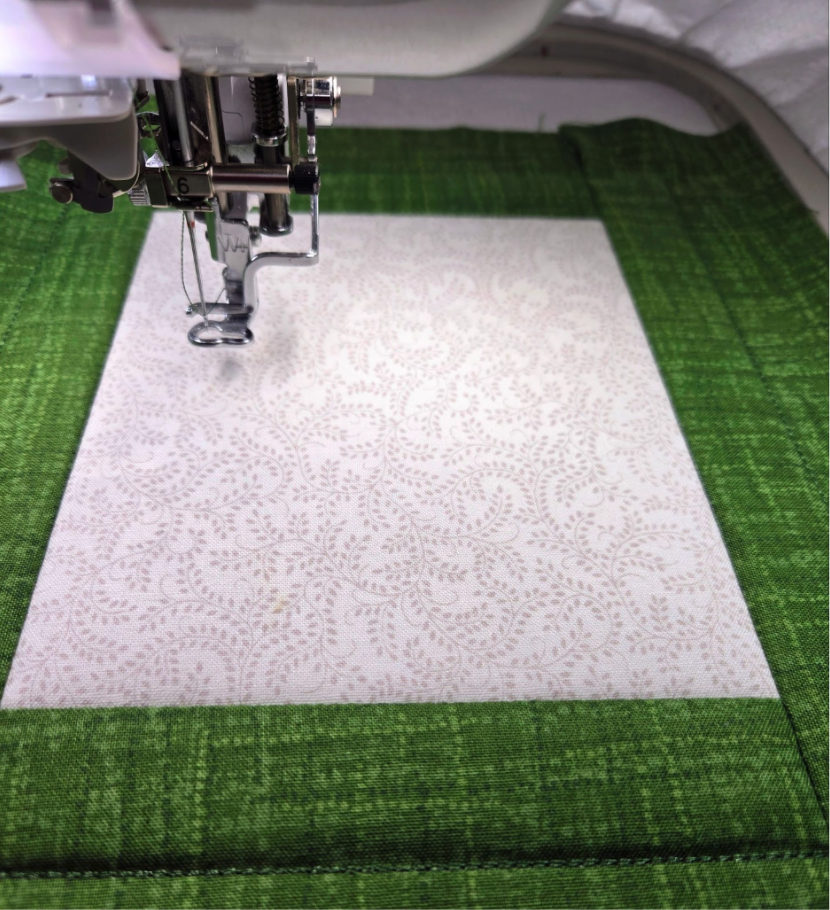 When making a placemat, you need more than one of each border design, so the designs come in sets of two. For my purposes, I only need one vertical design and one horizontal design. I put the designs I wanted on my USB. (There are a lot of options for each placemat, and they can be used interchangeably—zigzags, double zigzags, and other designs.) I chose my favorites and followed the placemat instructions for the placement and tack-down of one design.