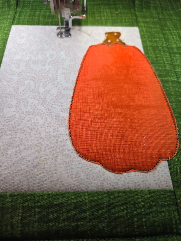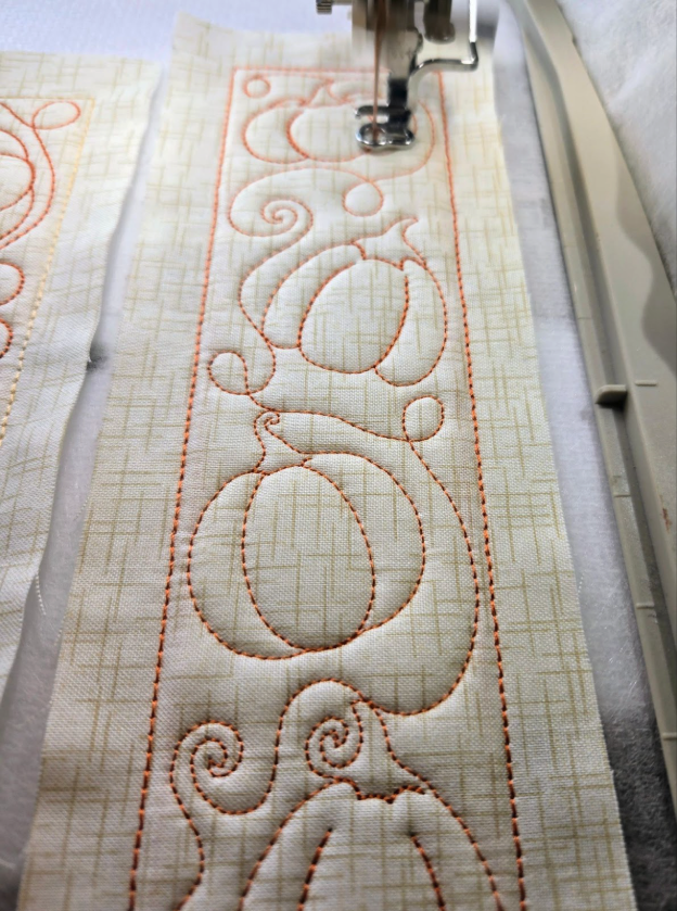 Since the pumpkins are a quilting design, they are less dense than the placemat border designs. The placemat borders were done in a triple stitch. I wanted my pumpkins to stand out as much as my other borders, so I left everything in the hoop and stitched each design twice.