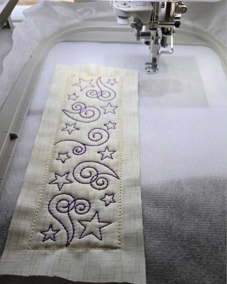 I chose the Stars & Swirls design from the Witch Feet Placemat to go outside my Word Art block. I stitched one of the 6x10 vertical designs. Leaving everything in my hoop, I got out of that design without embroidering a second one. Then I pulled up the 5x7 horizontal design, advanced the stitching using the arrow buttons until I was on the right side of the hoop, and stitched one 5x7 design in the same hooping.