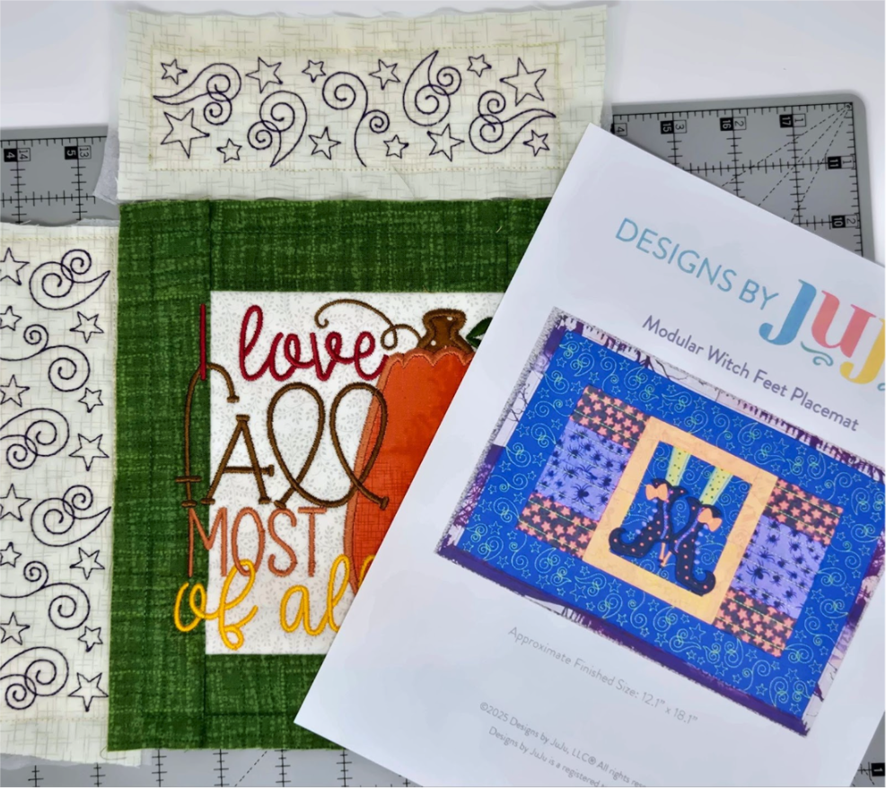 Now it is time to get your creative mind buzzing! Think about using a placemat design on a denim jacket, or make treat bags for the littles with the witch feet or jack-o’-lantern on one side and the crazy patch center on the other. How about decorating a towel? An apron? Or a garden flag? These designs are definitely not only for placemats, and since they are all the same size, you can mix and match to your heart’s content!