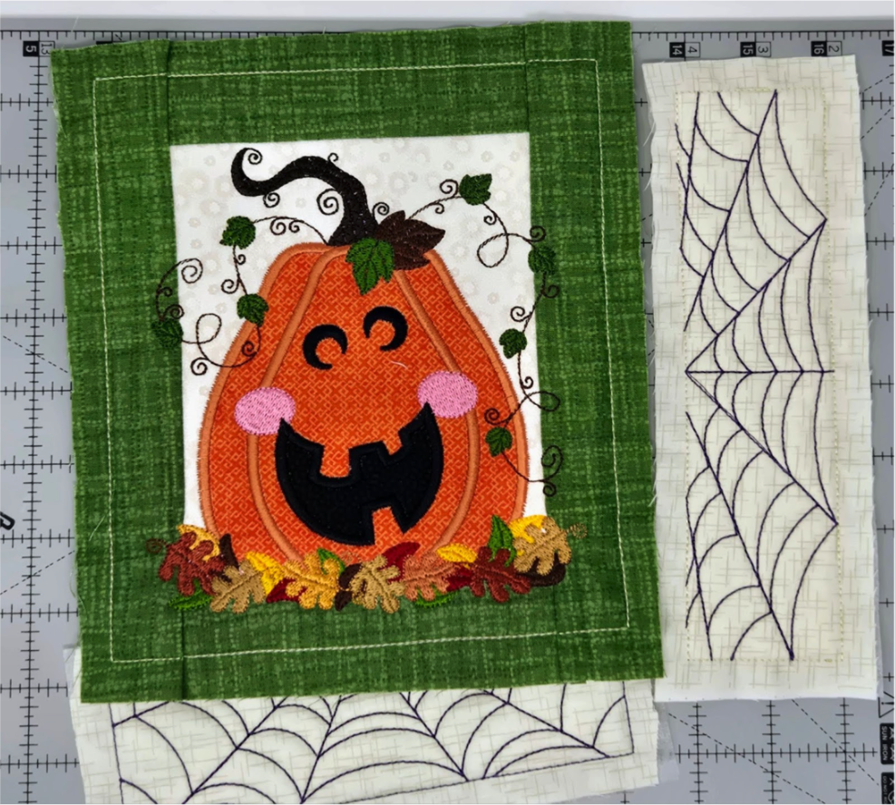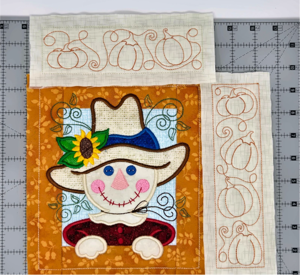 For the scarecrow, I wanted something with more embroidery than the zigzags and I did not want to repeat a design from the other placemats, so I went to my library and found the Pumpkins & Swirls Quilting Backdrop—the sashings are perfect! My scarecrow can be in a pumpkin field! I chose the horizontal 2x7 and vertical 2x8 sashing sizes. Choose the QAYG (Quilt As You Go) files and you will get the placement and tack-down portions for your batting and fabric.