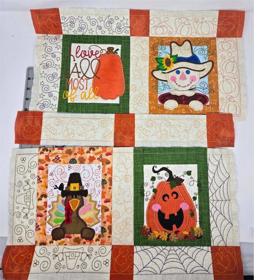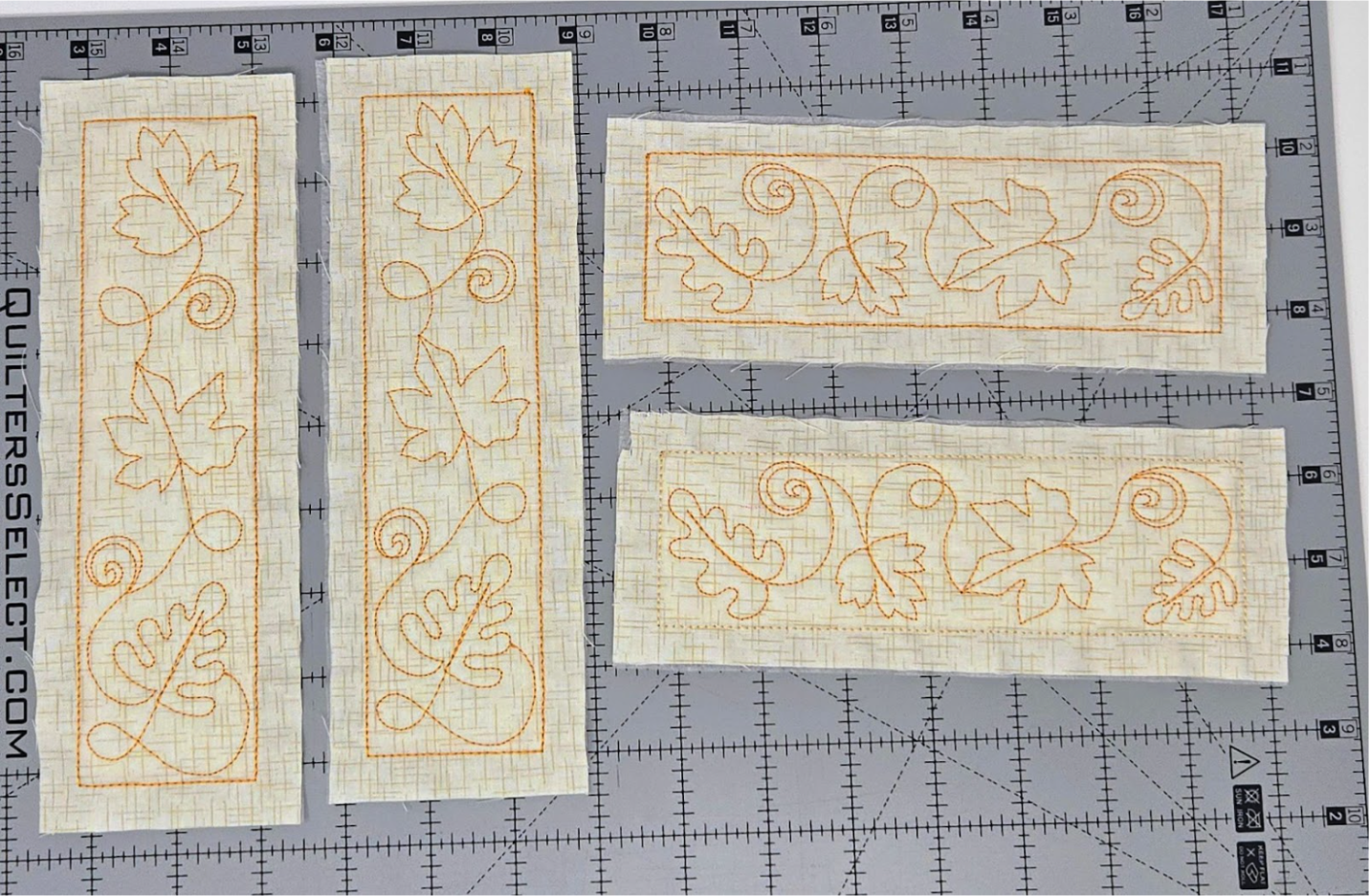 I laid out my blocks and borders and decided that I wanted some sashing in the center between my blocks. Autumn 3 Quilting Backdrops provides the perfect leaf designs. I chose a 2x7 horizontal design and a 2x8 vertical design. I needed to stitch each twice. Remember to choose the QAYG files so you have the placement and tack-down stitching. I did not stitch over these twice as I wanted them to be more subtle.