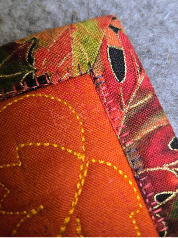Continue to follow the placemat instructions to add a backing and quilting. I also did my binding like the placemat was done. I chose a machine blanket stitch to stitch my binding down. The placemat instructions also tell you how to make a nice mitered binding corner.
