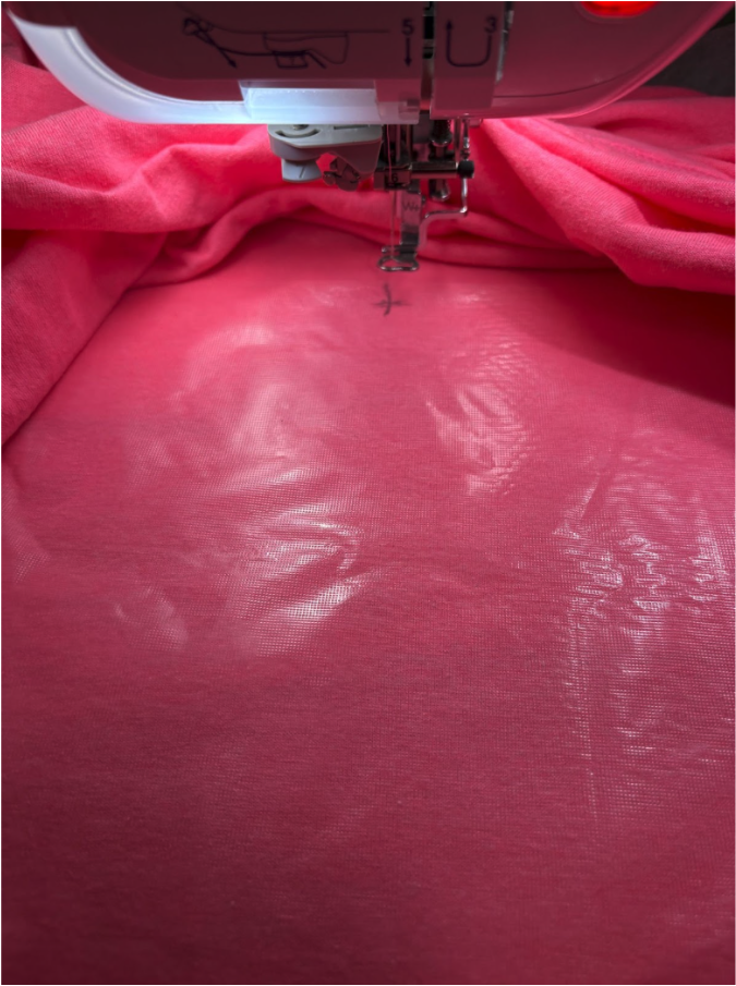 Line up the center mark on your shirt with the center mark on the stabilizer. Smooth the shirt flat without stretching it. The spray adhesive will keep the knit fabric from shifting during stitching. If you want, pin the shirt to the stabilizer, but keep pins away from the stitching area.