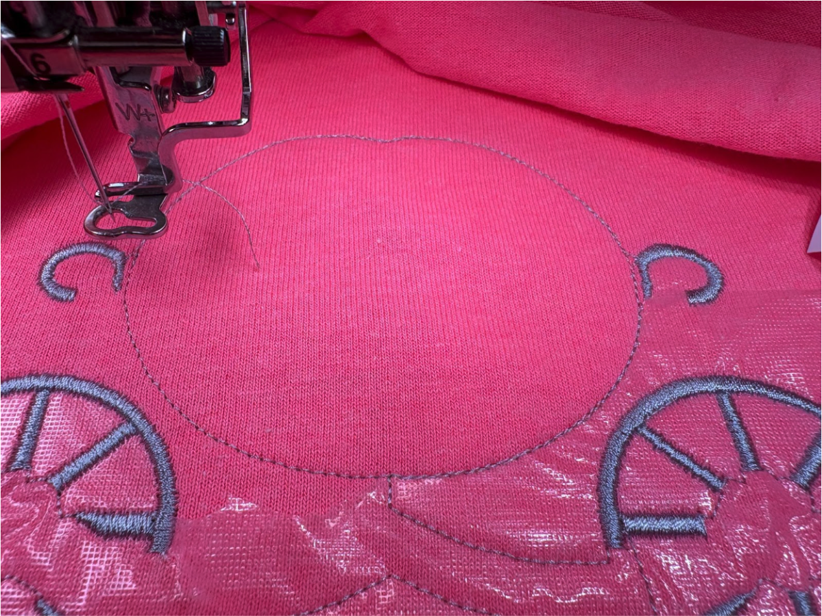 Stitch the embroidered area, then remove the topper before starting the applique stitches.