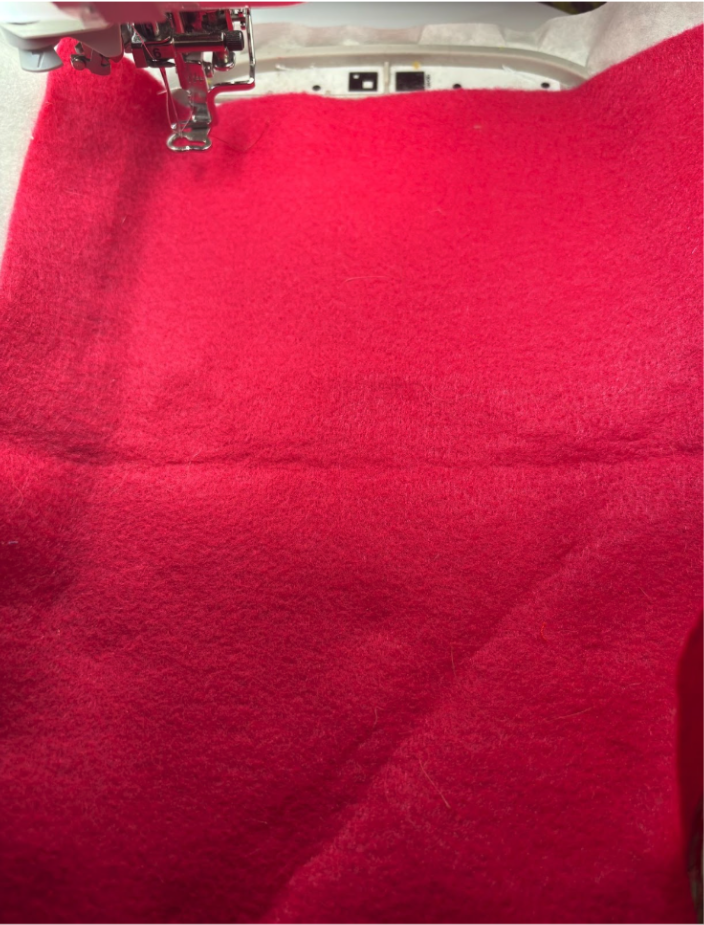 Run the placement stitch for the front of the bag, then place the felt over the stitches. Be sure to leave enough room for trimming later.