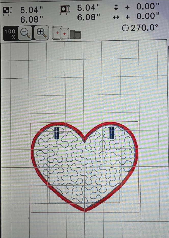 When finished, do not remove the design from the hoop. Return to the beginning of the design. Advance to step 5. We need to add the back, the satin stitch around the shape, and the openings for the ribbon.