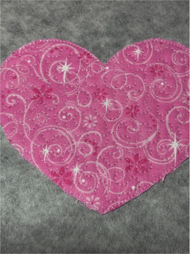 The first step is the placement stitch for the batting. Place the batting over the stitches and run the tack-down stitch. Remove the hoop and place on a flat surface. Trim the batting close to the stitches.