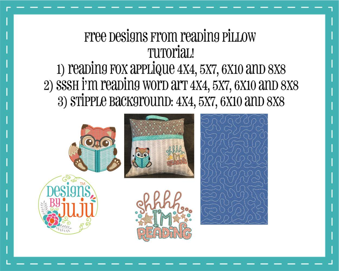 The Reading Pillow tutorial features three new designs available for FREE download. The FREE Reading Pillow Tutorial Embroidery Designs include our Reading Fox Applique, "Shhh... I'm Reading" Word Art and Stipple Background. The designs are downloadable for free (yes, free!). All we ask is that when you download them, you find a way to pay it forward by making something to donate or give as a gift to another individual or organization to bless them. 🙂