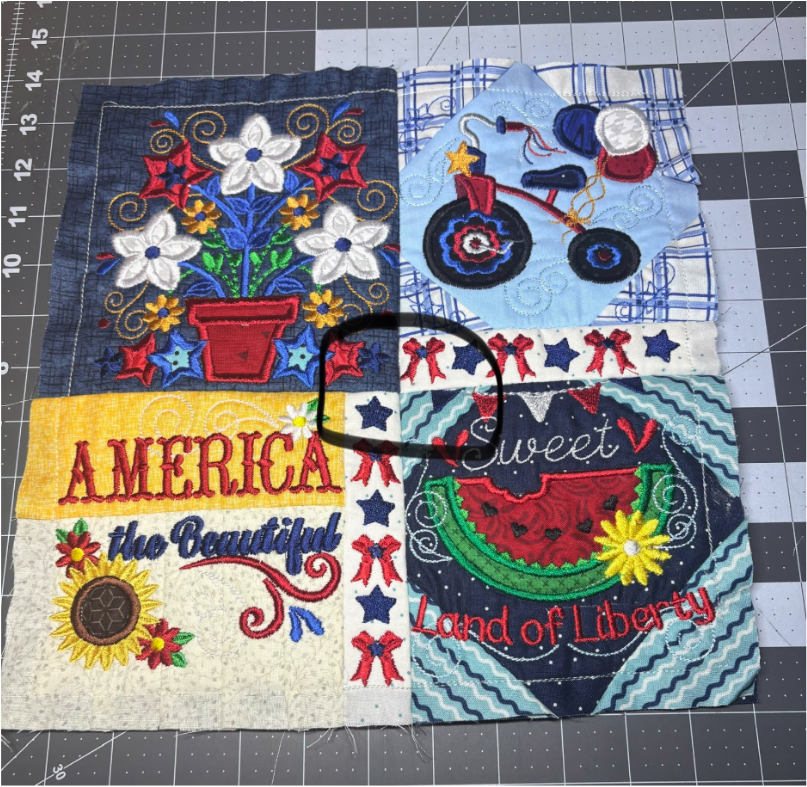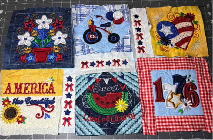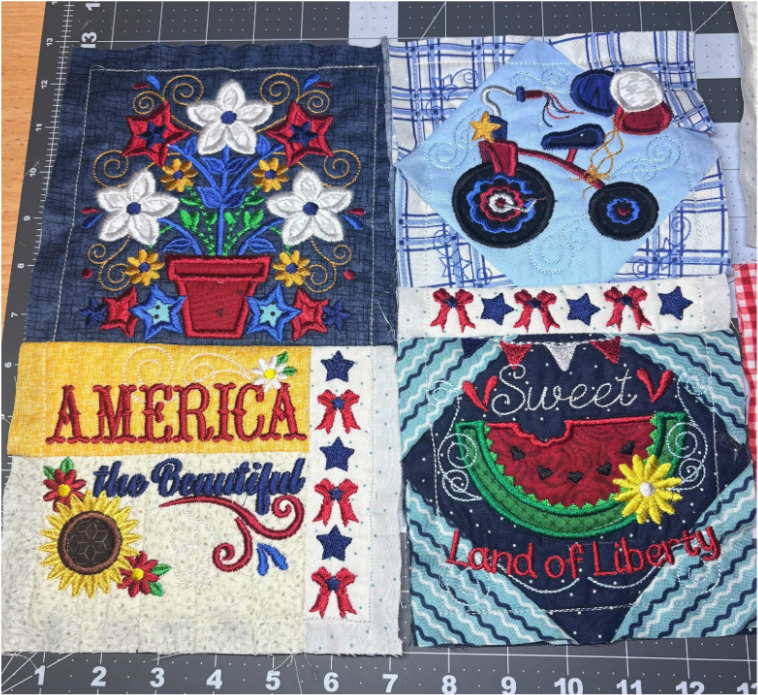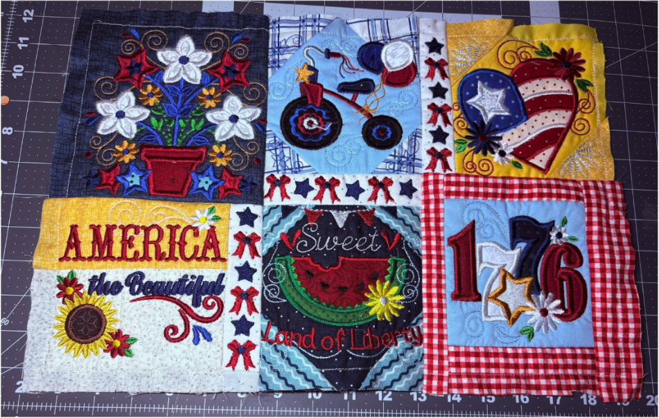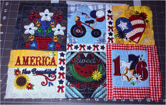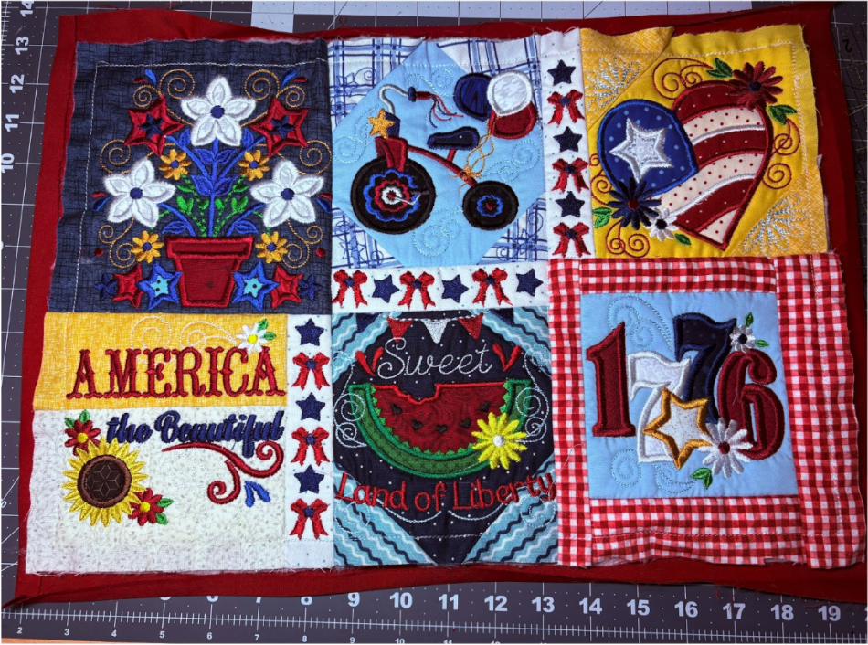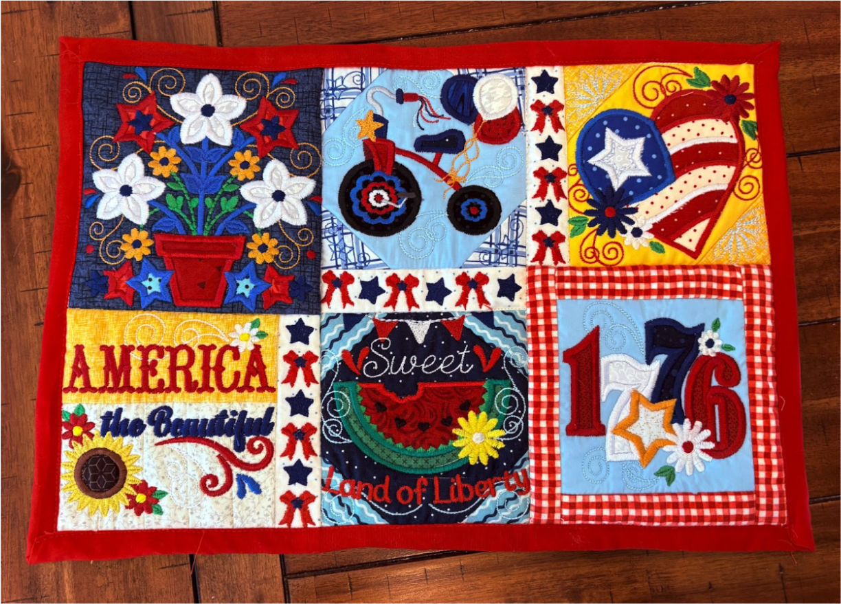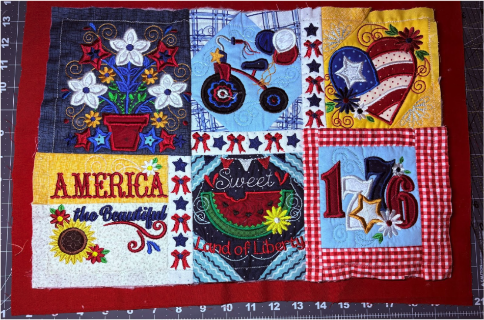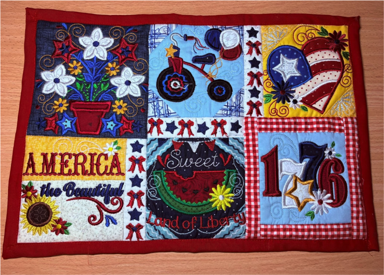 For my placemat, I mixed and matched designs from all four sets. From Set 1, I chose 1776 in 6” x 6”; from Set 2, Baltimore Album Flower Pot in 6” x 6”; from Set 3, America the Beautiful in 5" x 5" and Big Heart with Daisies in 5” x 5”; and from Set 4, Sweet Land of Liberty Watermelon in 5" x 5" and the Tricycle in 5” x 5”. You can use these or your own favorites.