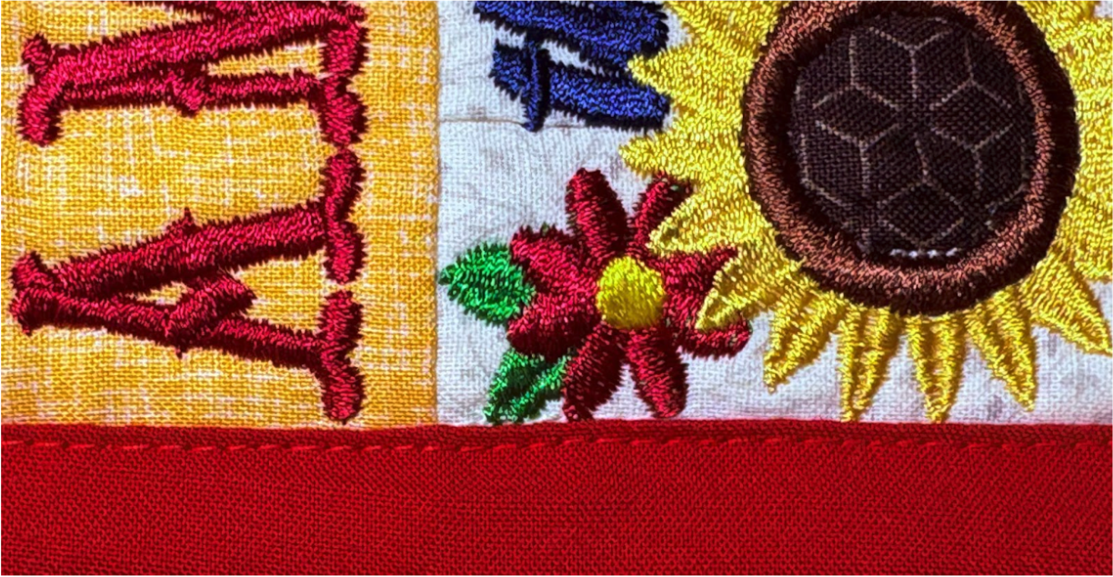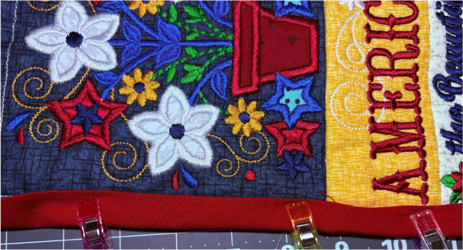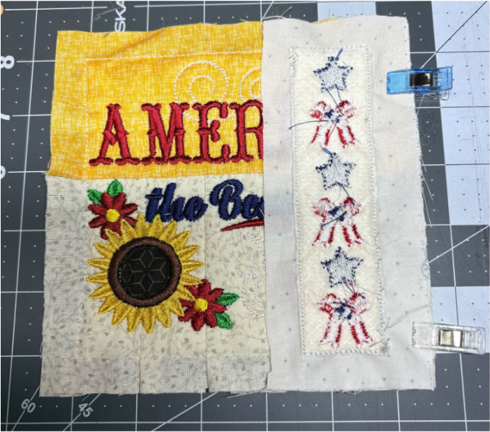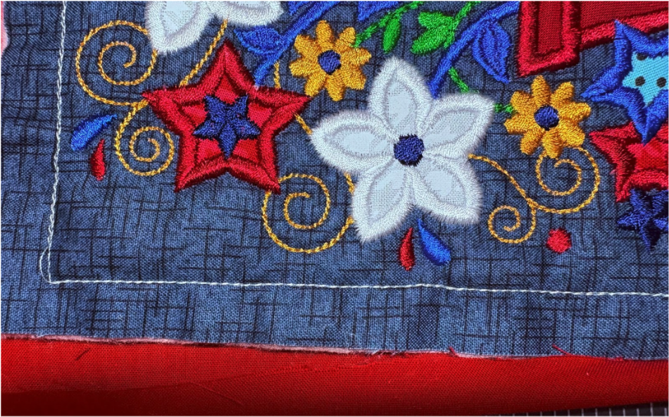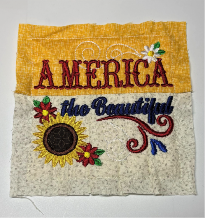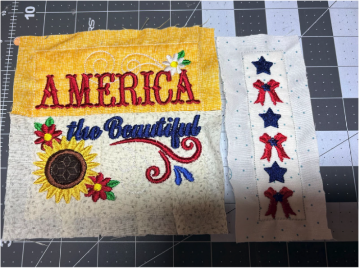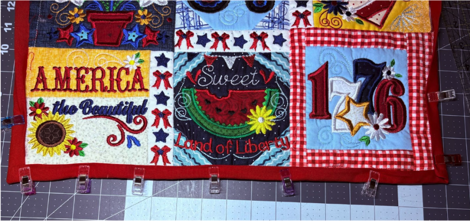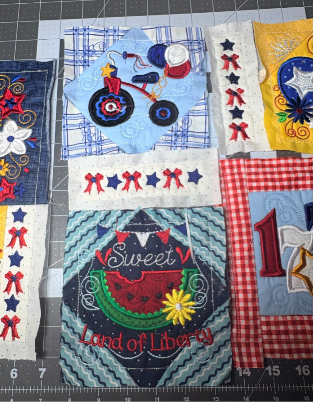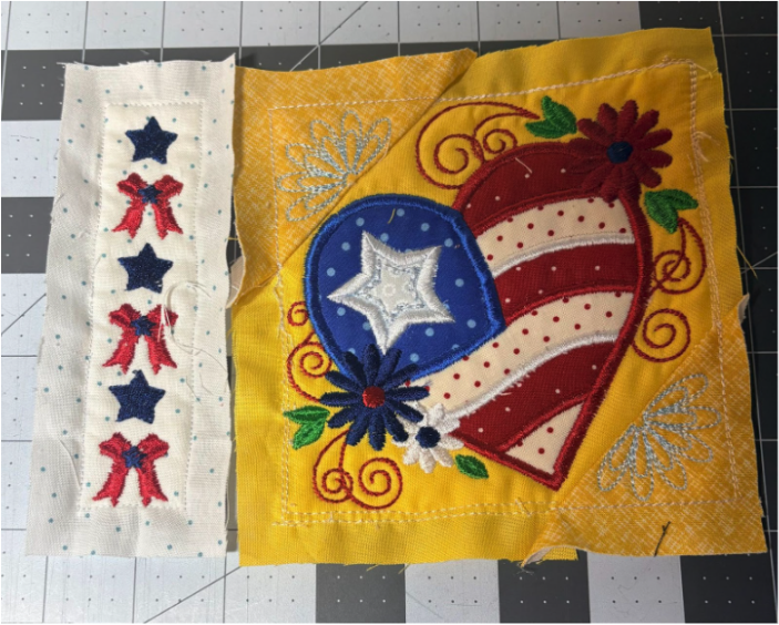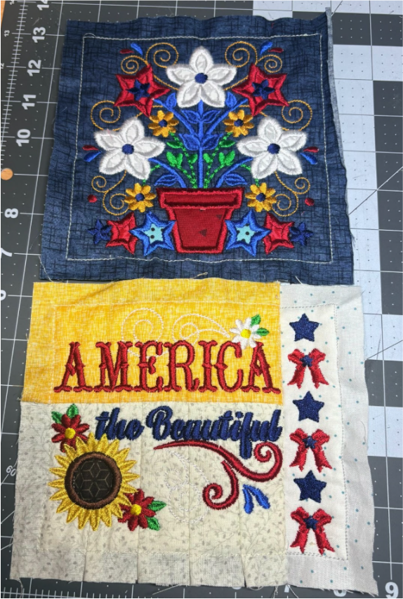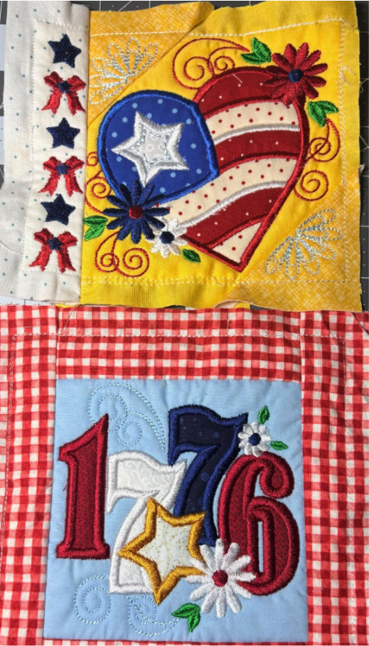 For my placemat, I mixed and matched designs from all four sets. From Set 1, I chose 1776 in 6” x 6”; from Set 2, Baltimore Album Flower Pot in 6” x 6”; from Set 3, America the Beautiful in 5" x 5" and Big Heart with Daisies in 5” x 5”; and from Set 4, Sweet Land of Liberty Watermelon in 5" x 5" and the Tricycle in 5” x 5”. You can use these or your own favorites.