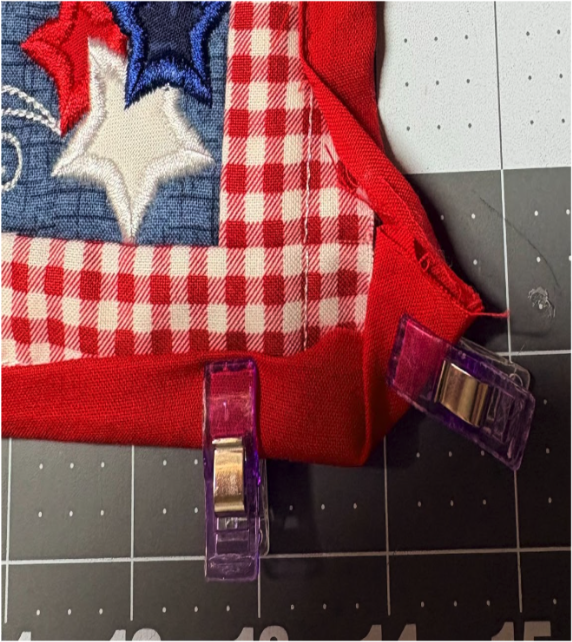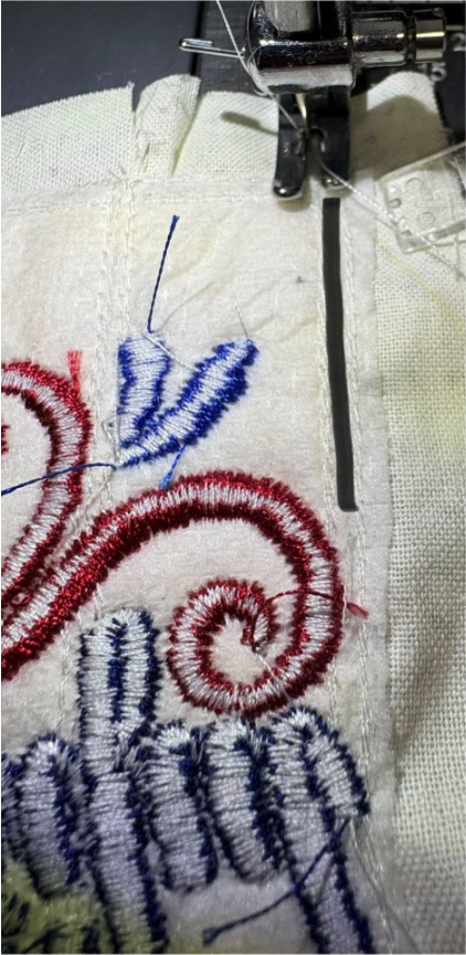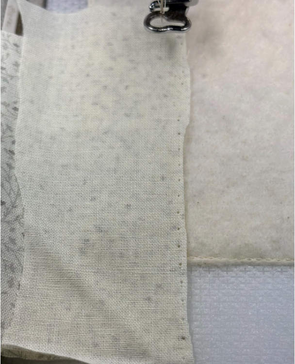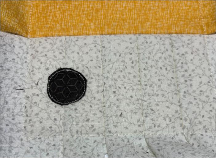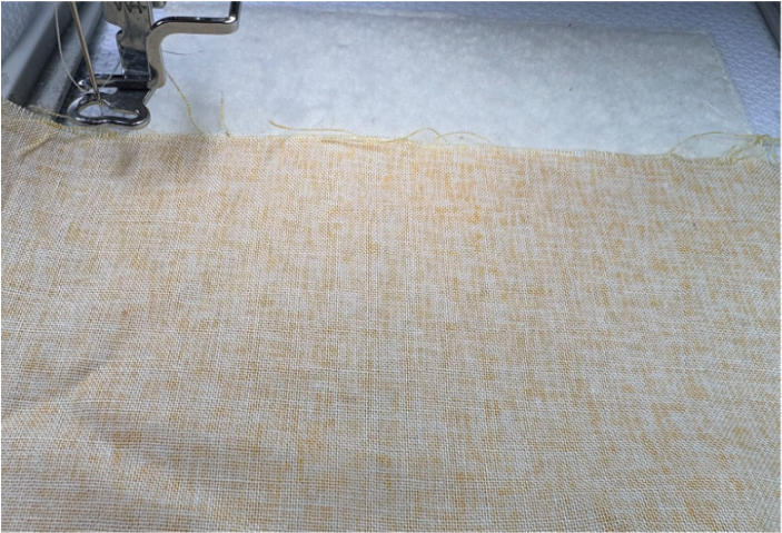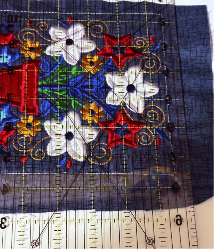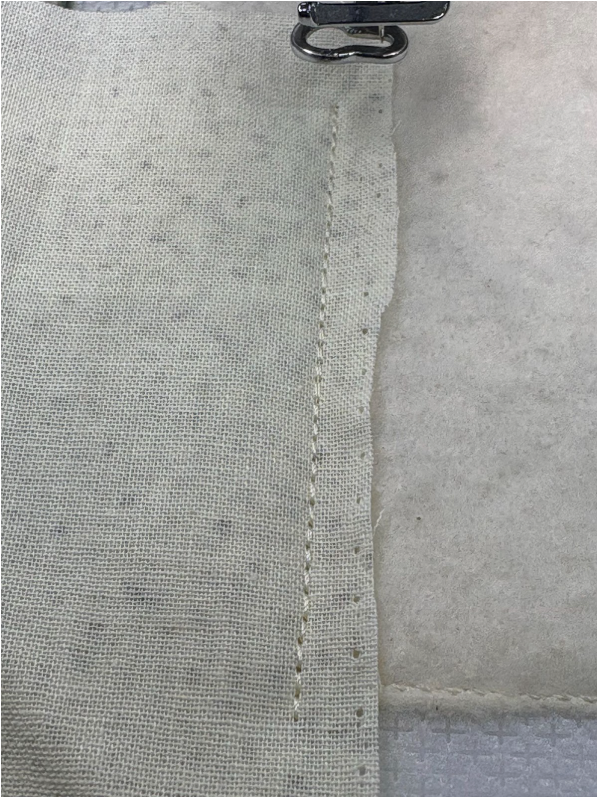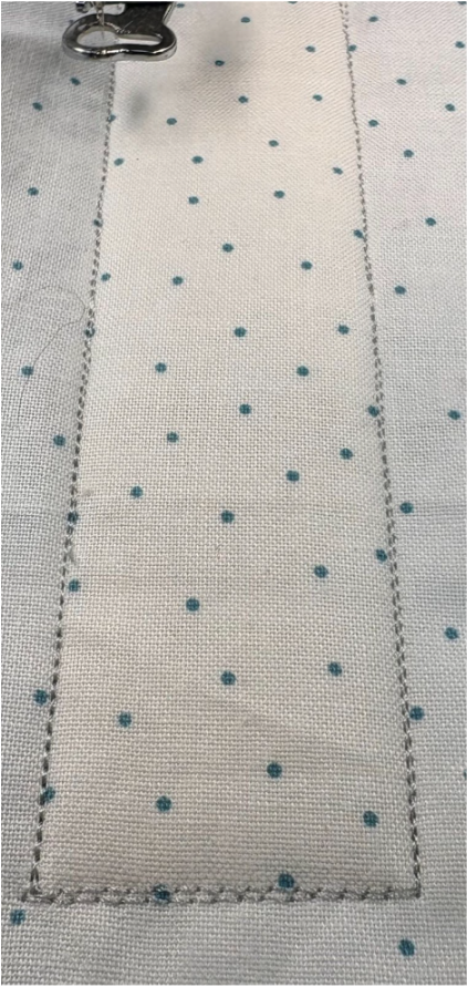 Position the strip over the stitches, ensuring there’s at least ½” extra on the top, bottom, and sides. Sew the next step, which is the tack-down stitch. This piece will be right side up.