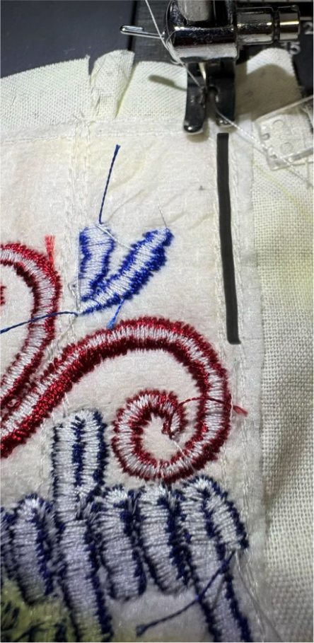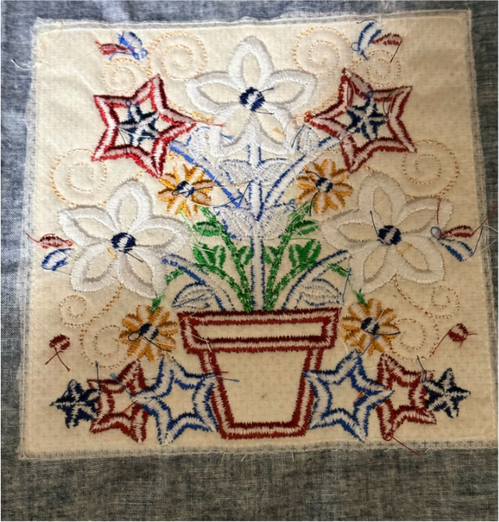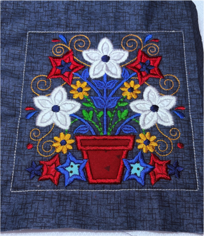 When you finish all the applique, complete the block with satin edge and decorative stitches. When your block is done, remove it from the hoop, trim away any excess stabilizer, and trim your block ½” from the outer stitches.
