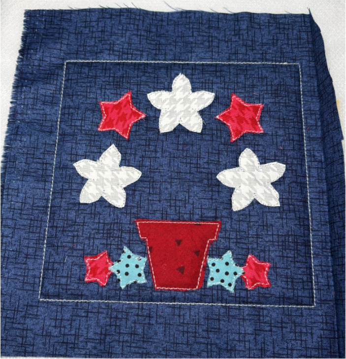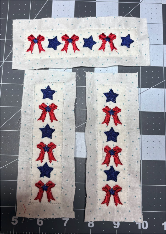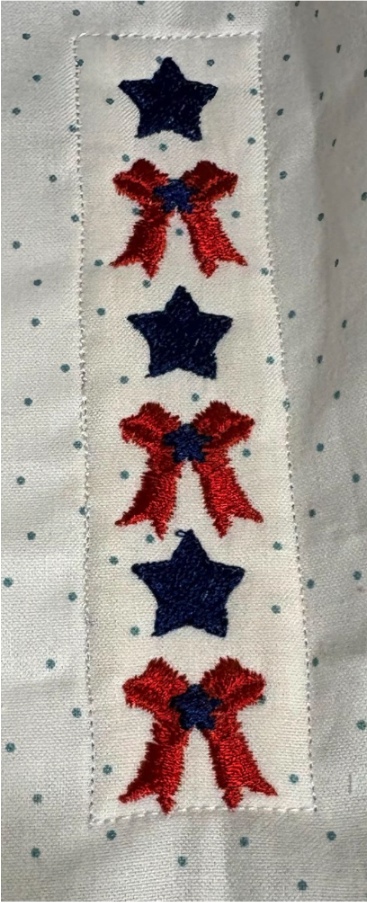 Open the Daisy Doodle Patriotic Bean Stitch Applique Embellishment Set and choose the 2½” size. Several of these designs will fit inside your sashing block. I used the bow and a star. Ensure your designs are under 1”.