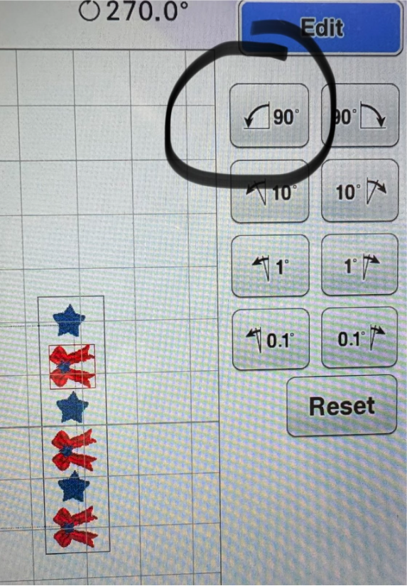 After making two vertical borders at 1¼” x 5”, I made a horizontal one by rotating the bows 90° in my machine’s Edit menu. You don’t need to make a new rectangle. Just rotate the designs as needed.