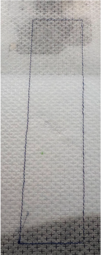 Place the batting down, stitch the rectangle again, then remove the hoop, trim the batting, and return the hoop to the machine.