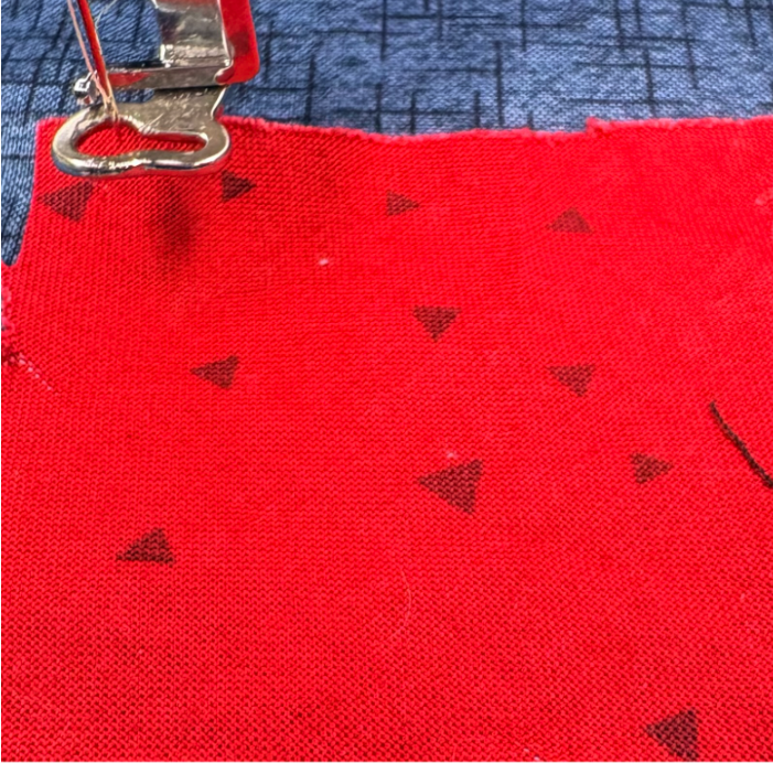 Sew the next step, which places the line for the second strip of fabric. Position the raw edge of the next fabric strip right side down, about ⅛” to ¼” from the stitch line.