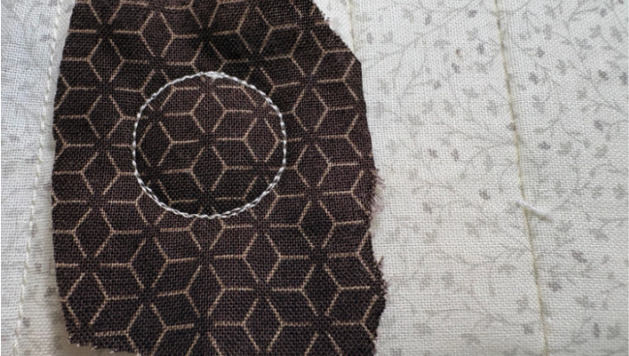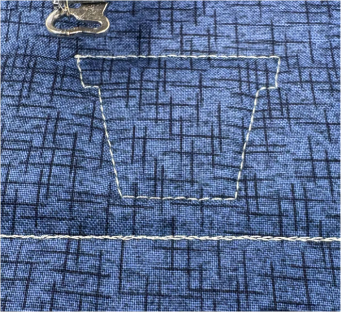 Once your background fabric is in place, move on to the applique. The first stitch for applique is always the fabric placement stitch.