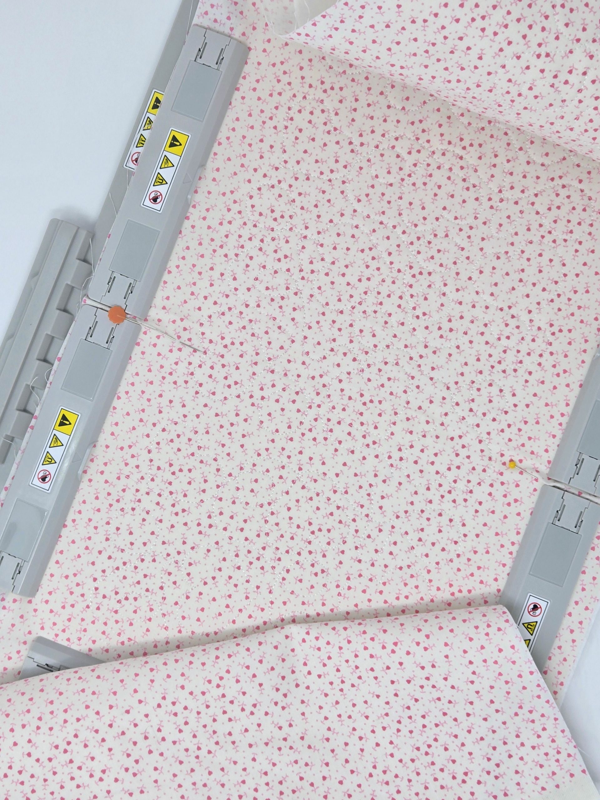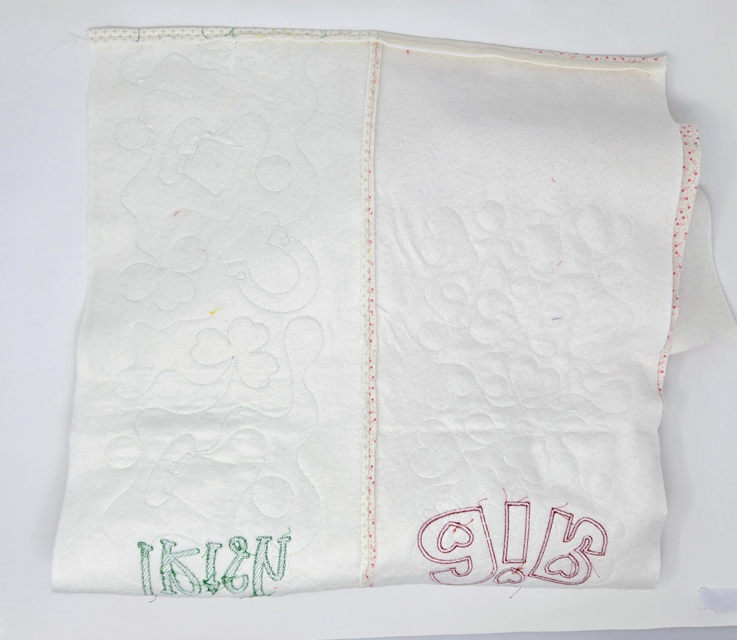 Using my largest magnetic hoop (7x12) and layering only my fabric and batting, I embroidered the quilting design. Because I chose an 8x8 quilting design, I had to shrink it on my machine to fit the hoop for the Valentine quilting. I quilted in white so it doesn’t really show but will give the pillow wrap great texture!