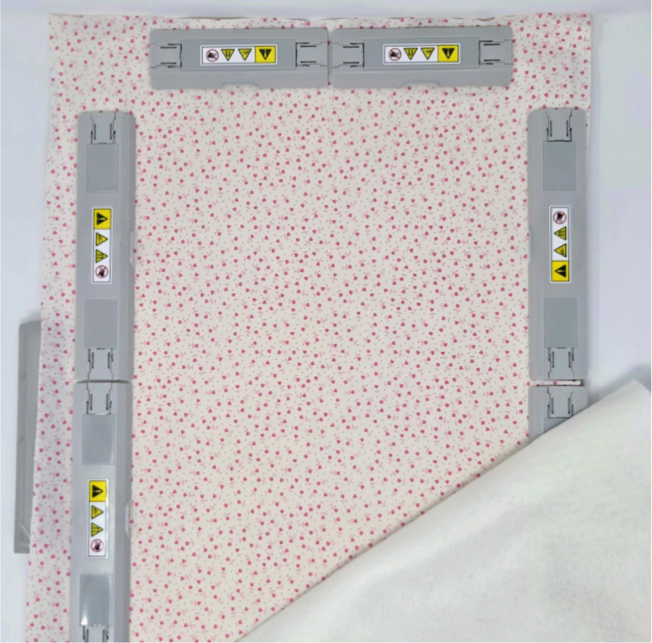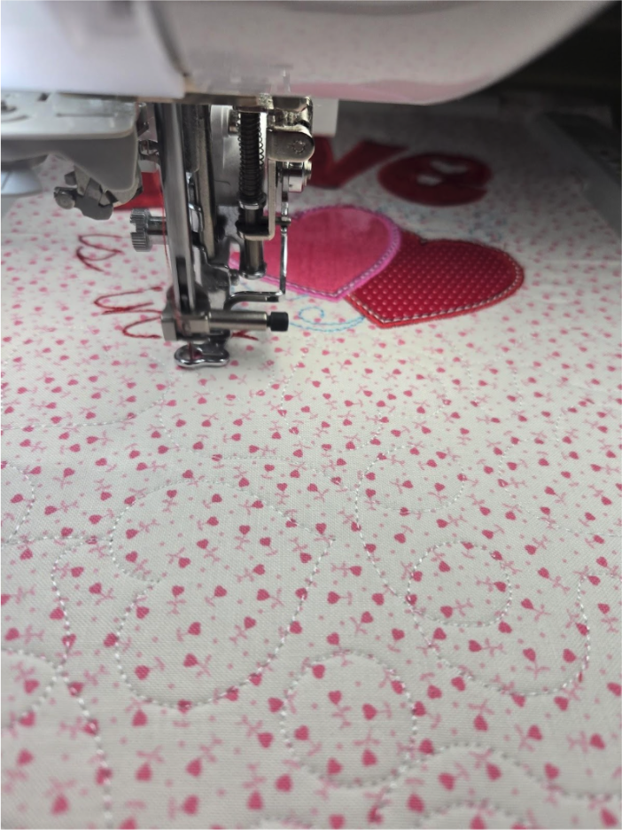 Using my largest magnetic hoop (7x12) and layering only my fabric and batting, I embroidered the quilting design. Because I chose an 8x8 quilting design, I had to shrink it on my machine to fit the hoop for the Valentine quilting. I quilted in white so it doesn’t really show but will give the pillow wrap great texture!