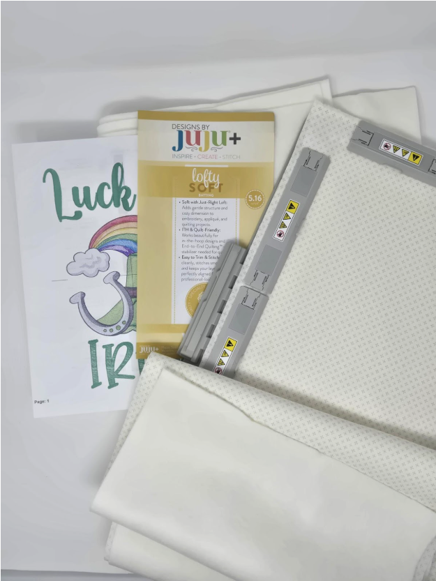 Repeat the above steps for the other side of the pillow wrap and your St. Patrick’s Day design. Gather your supplies and hoop your fabric and batting.