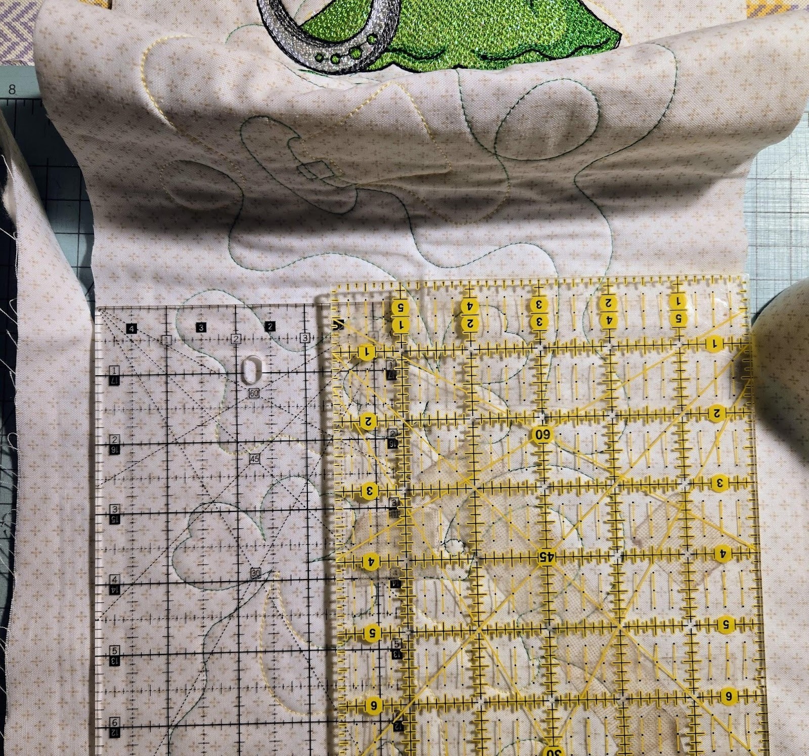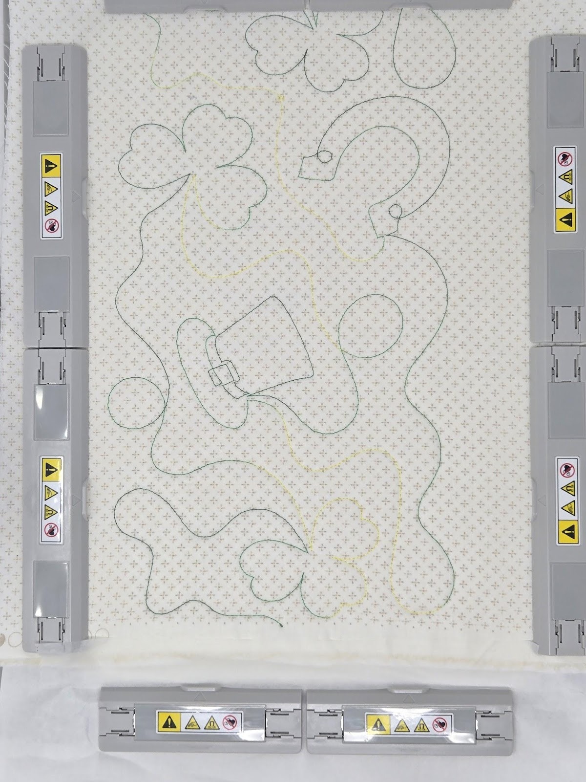 If you like the size of your embroidery design—spacing and size of images—then you can go right to your machine to quilt your fabric. This blog post gives an excellent tutorial on how to align the design from hooping to hooping: How to Align End-to-End Quilting.