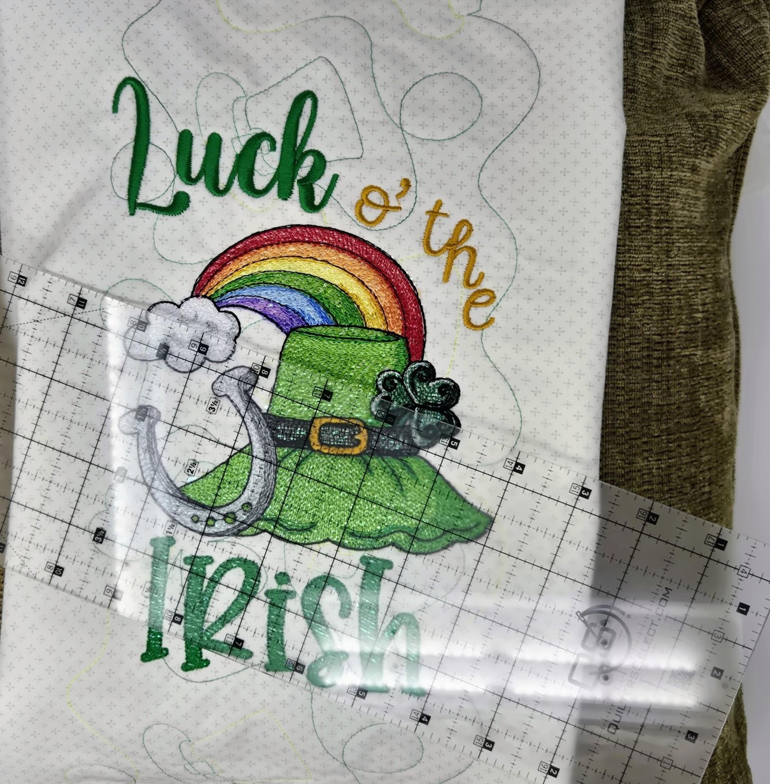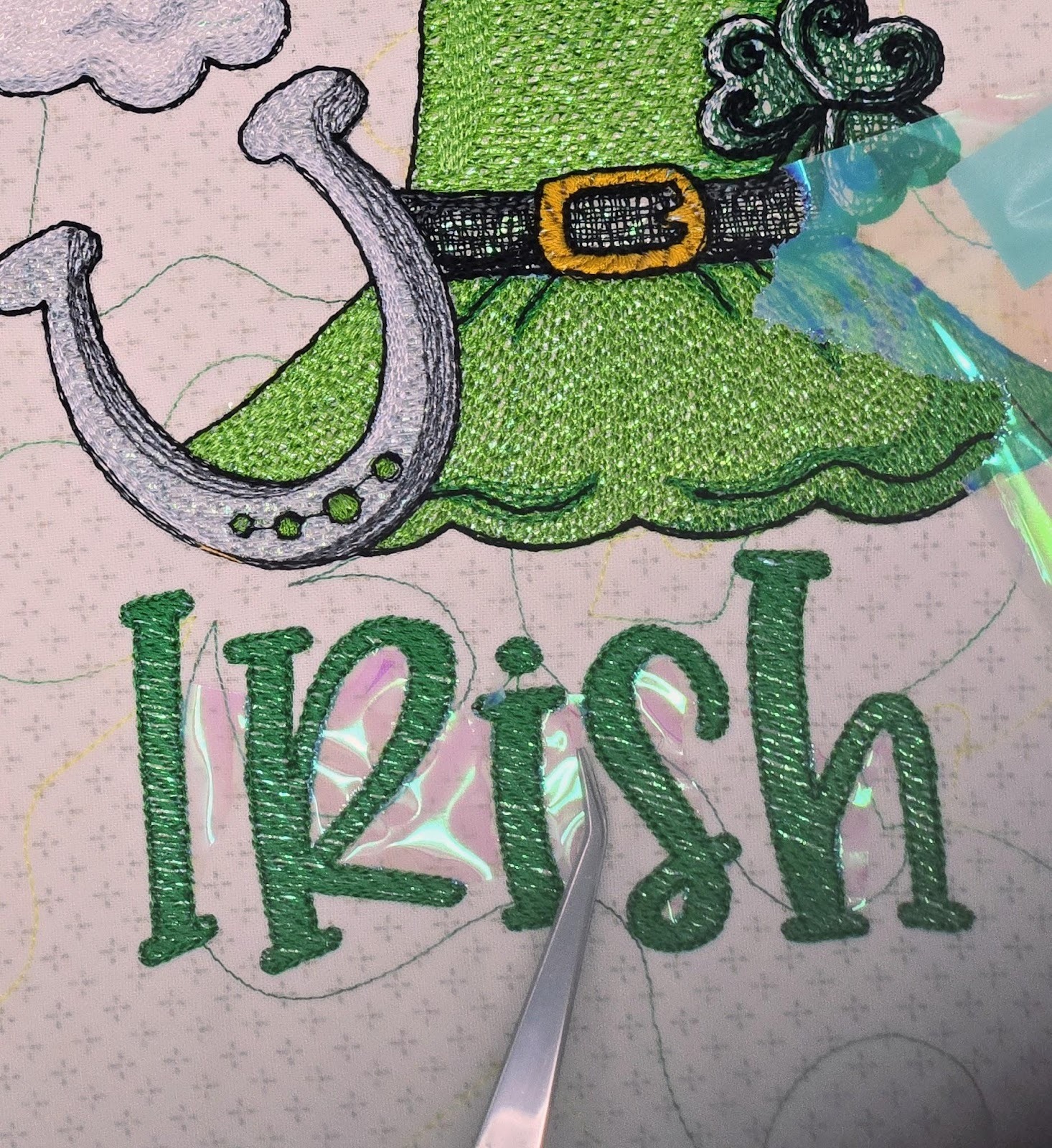 I taped the piece of Mylar down so it would be under the stitching of the embroidery design and the word “Irish” to give this part of the design sparkle. This works really well for sketch-type designs.