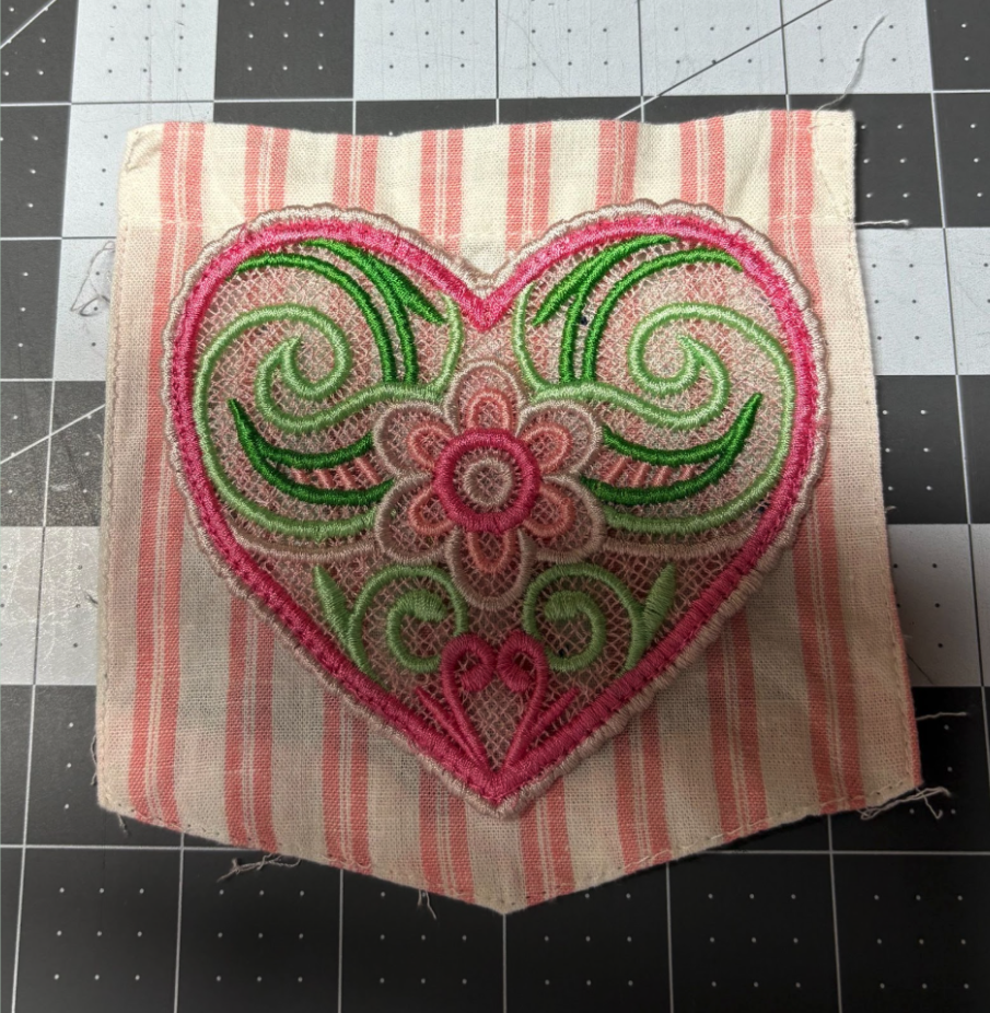 Start by choosing a freestanding lace design and loading it onto your machine. Choose a size that fits the pocket. Stitch the design, soak it in water, and let it dry.