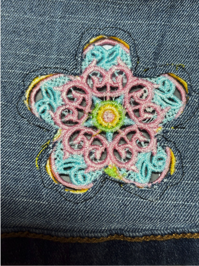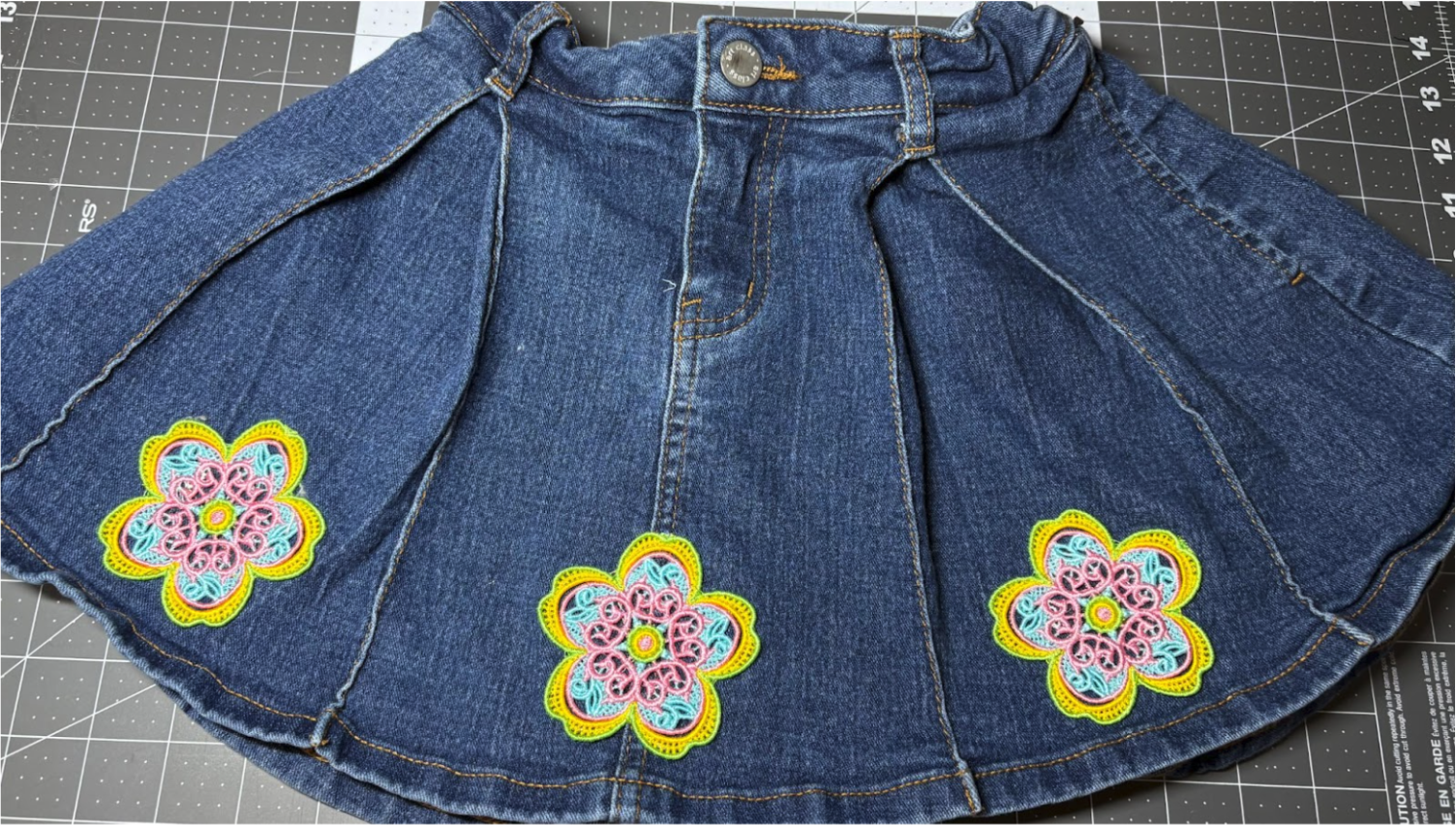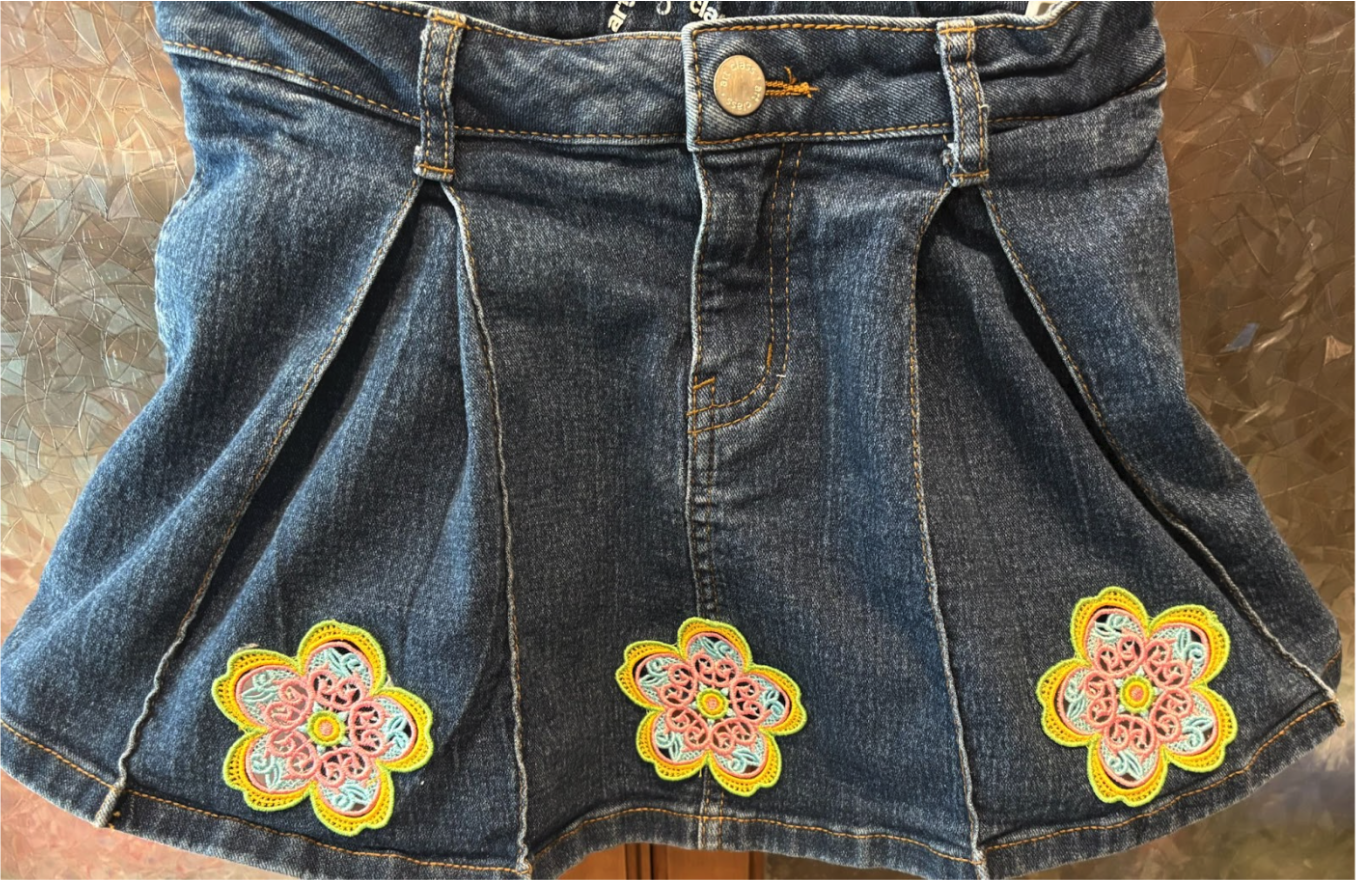 I’m going to update a child’s skirt using the Free Standing Lace Flowers 1. You can use any denim you have. If you have jeans with a hole, that works great. Or if you just want to add some color, grab your item and let’s get started.