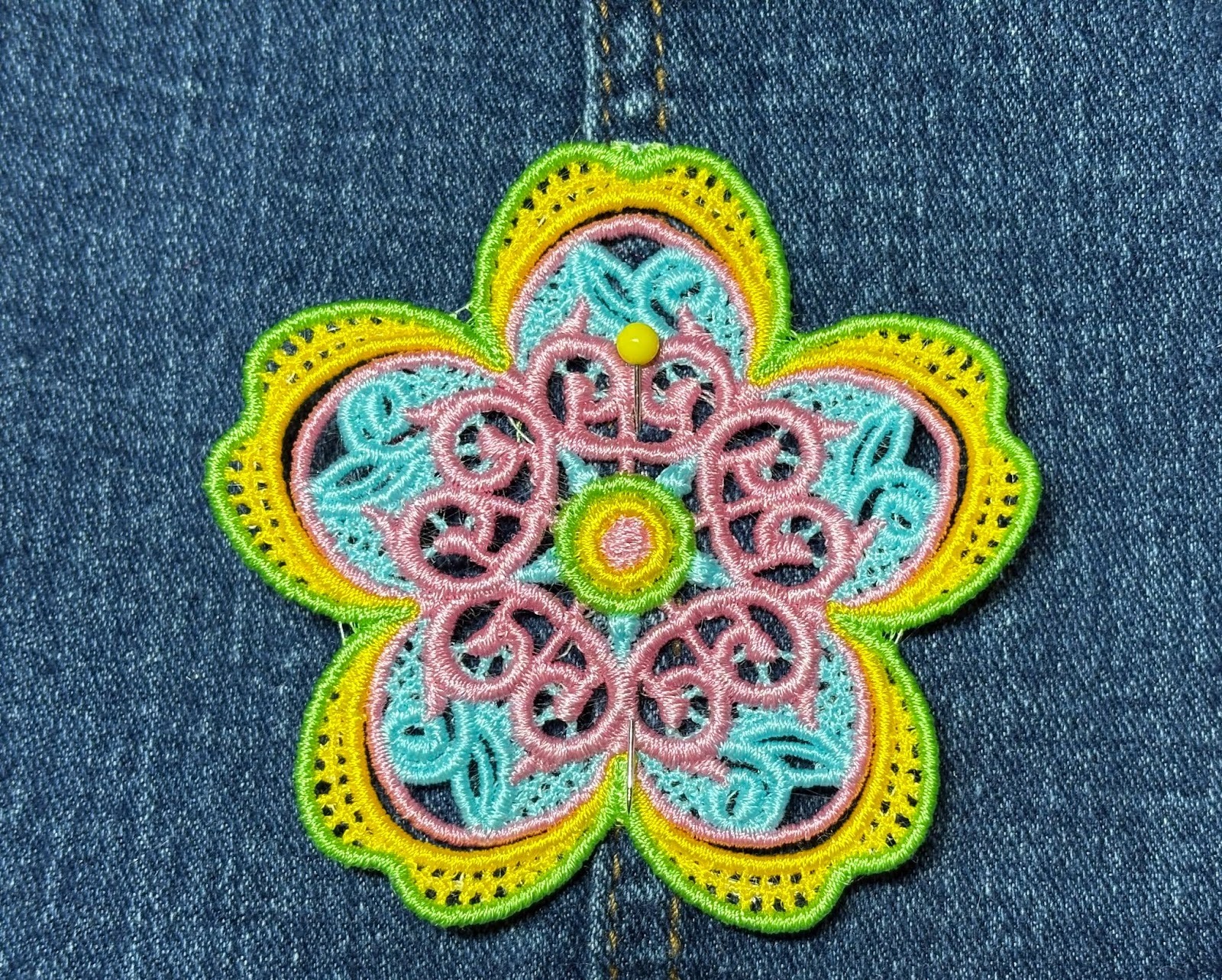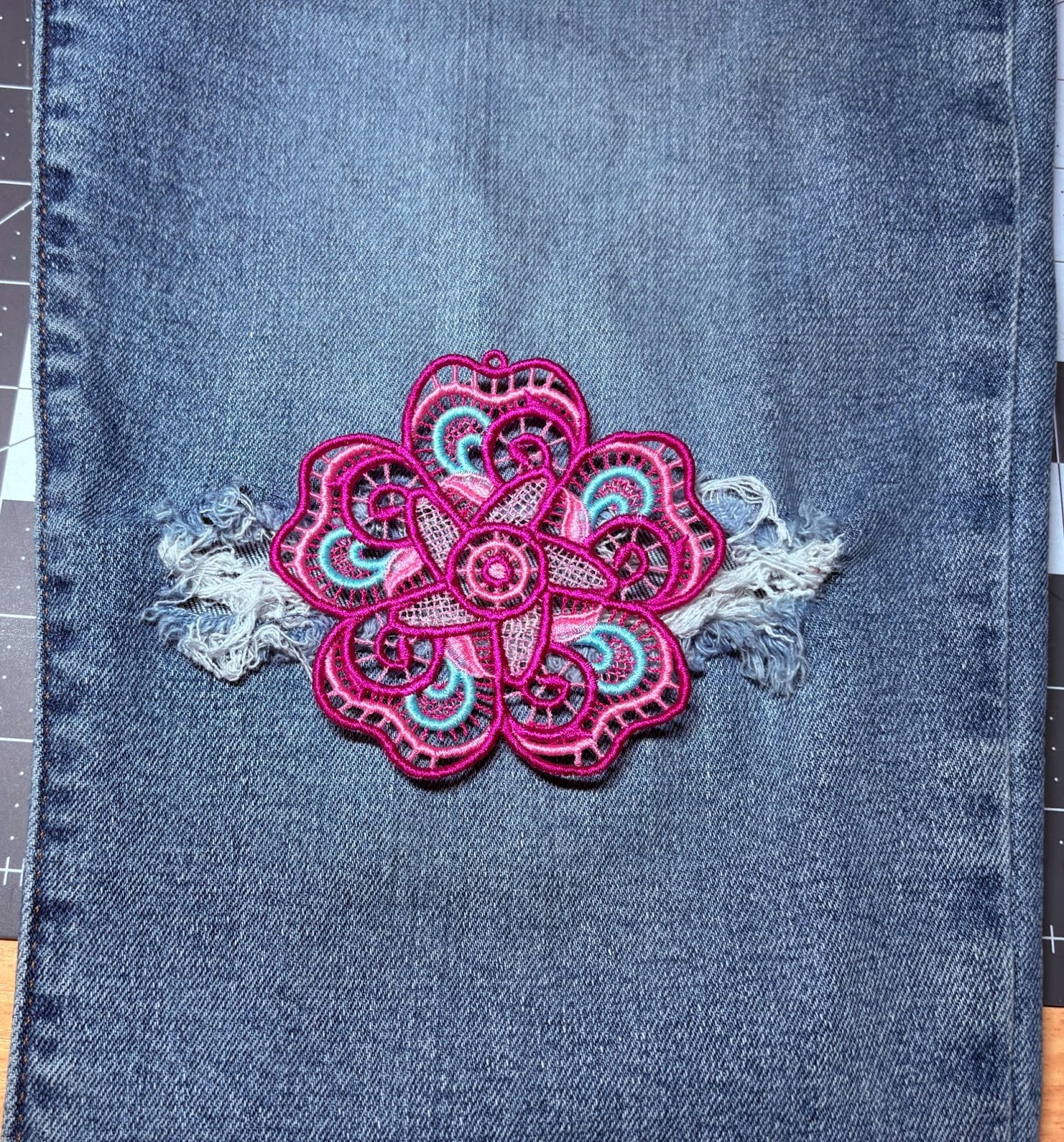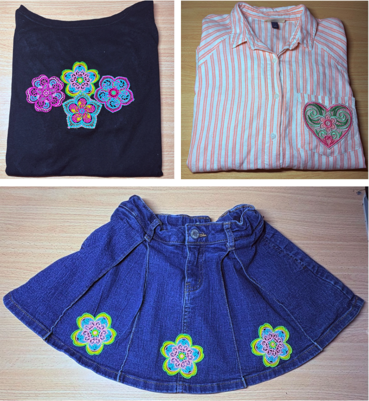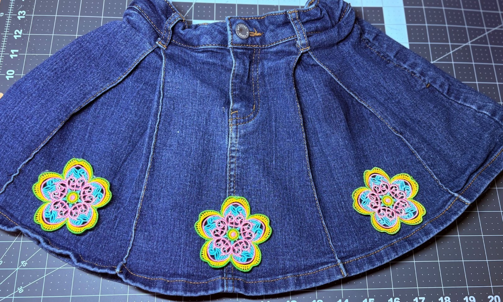 I’m going to update a child’s skirt using the Free Standing Lace Flowers 1. You can use any denim you have. If you have jeans with a hole, that works great. Or if you just want to add some color, grab your item and let’s get started.